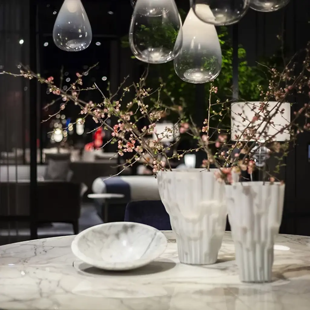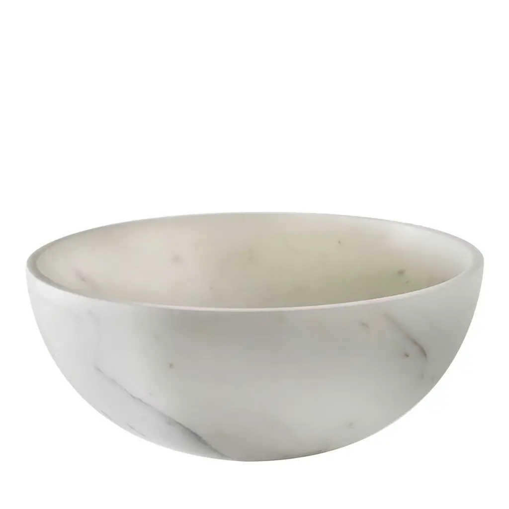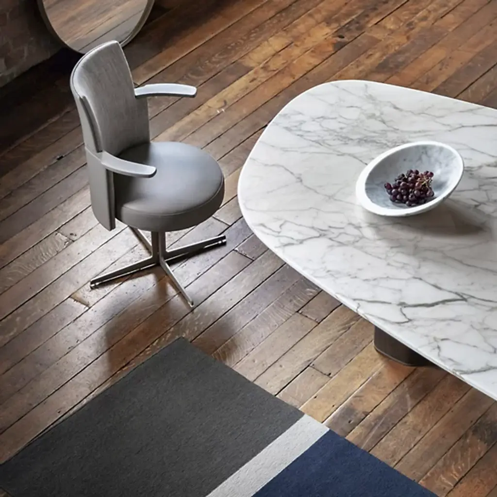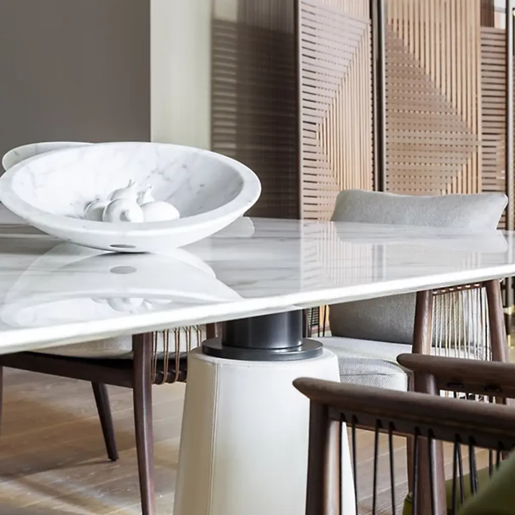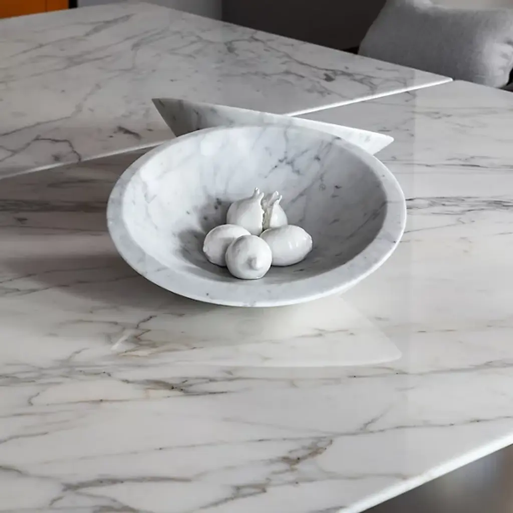 The Pura Bowl from Poltrona Frau’s asymmetrical design balances solids and voids, allowing it to rest naturally on one side. Crafted from marble using precision machinery, it is hand-smoothed to a semi-polished finish that retains its natural beauty. A circular brass plate with a Ruthenium finish on the underside is engraved with the designer’s signature and the Poltrona Frau logo, adding a refined touch.