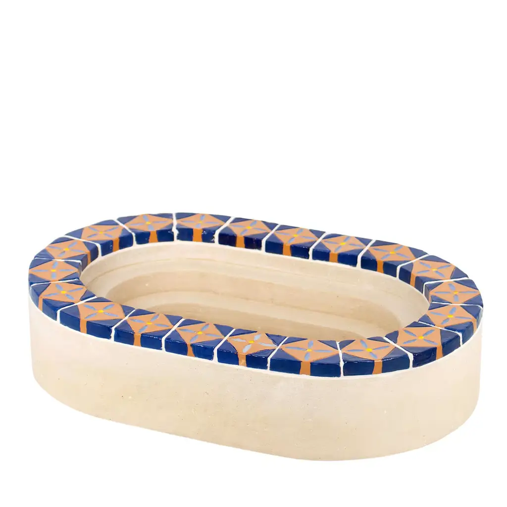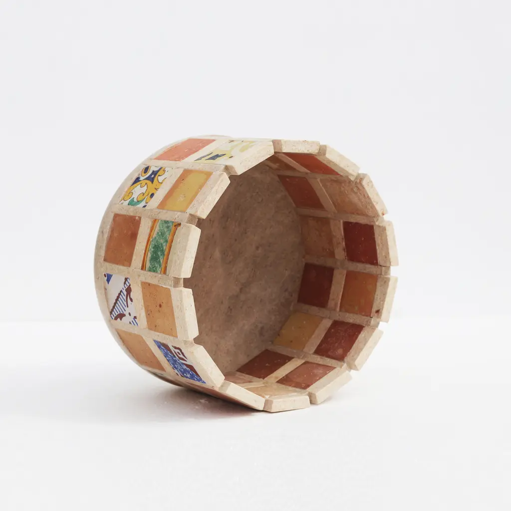 Create a stunning focal point in your home with a handmade vessel that features 19th century ceramics and Tunisian marble. The Quadrati (Squares) collection from Gumdesign takes inspiration from traditional Tunisian crochet work and tapestries. Each product is carefully handcrafted from Tunisian stone (Kheddel Grigio della Tunisia marble) and recovered pieces of late 19th century glazed ceramics. The vessel has a rounded base and form, with the rim boasting cut-outs that match the position of the squares. A work of art made from solid stone and stoneware, this products is one of a kind.
