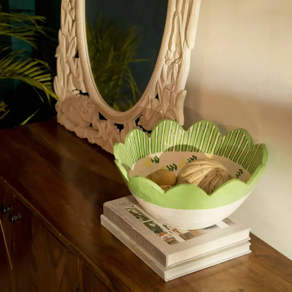 The bowl brings the spring into each space. These hand-painted and handmade decorative bowls are perfect for displaying collections, and objects. This item is not watertight and should not come in contact with water. Handcrafted and hand-painted ceramic.