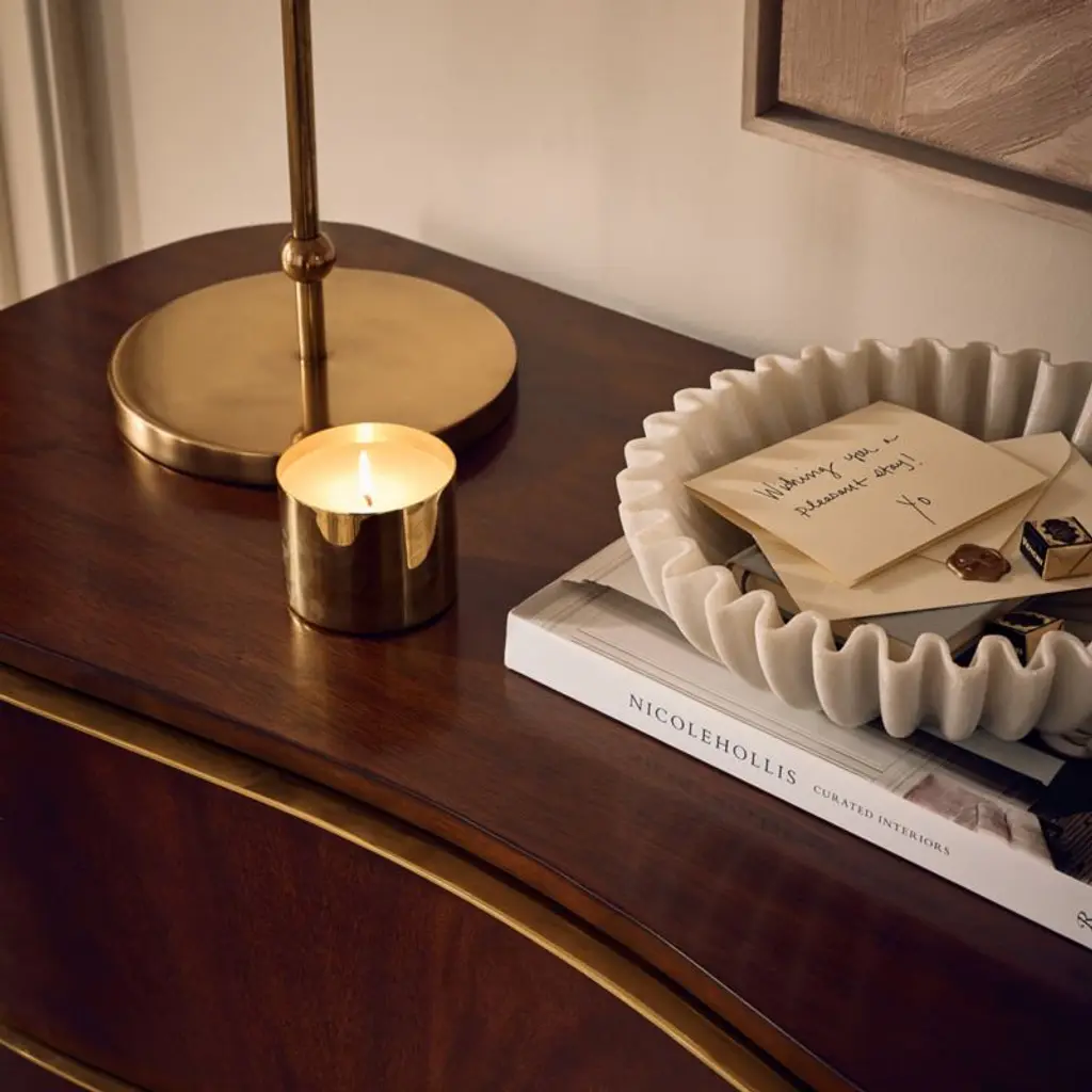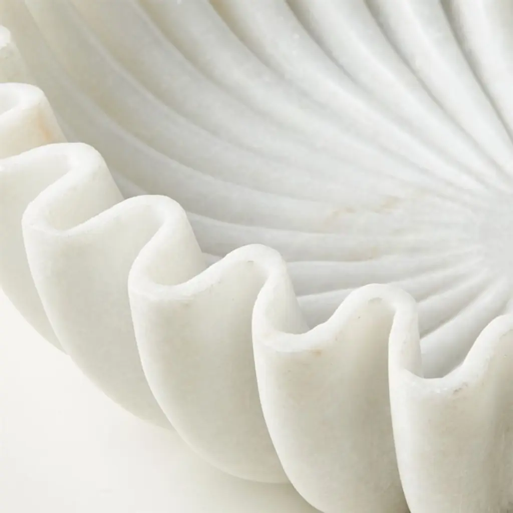 Solid chunk of Banswara Marble ripples round and round in impressively handcrafted bowl made in India. Ivory in color with subtle brown veining throughout. Decor piece is shaped using a unique tool armed by skilled craftsmen that delicately forms each and every fluteyou won't see marble transformed like this anywhere else. CB2 exclusive.