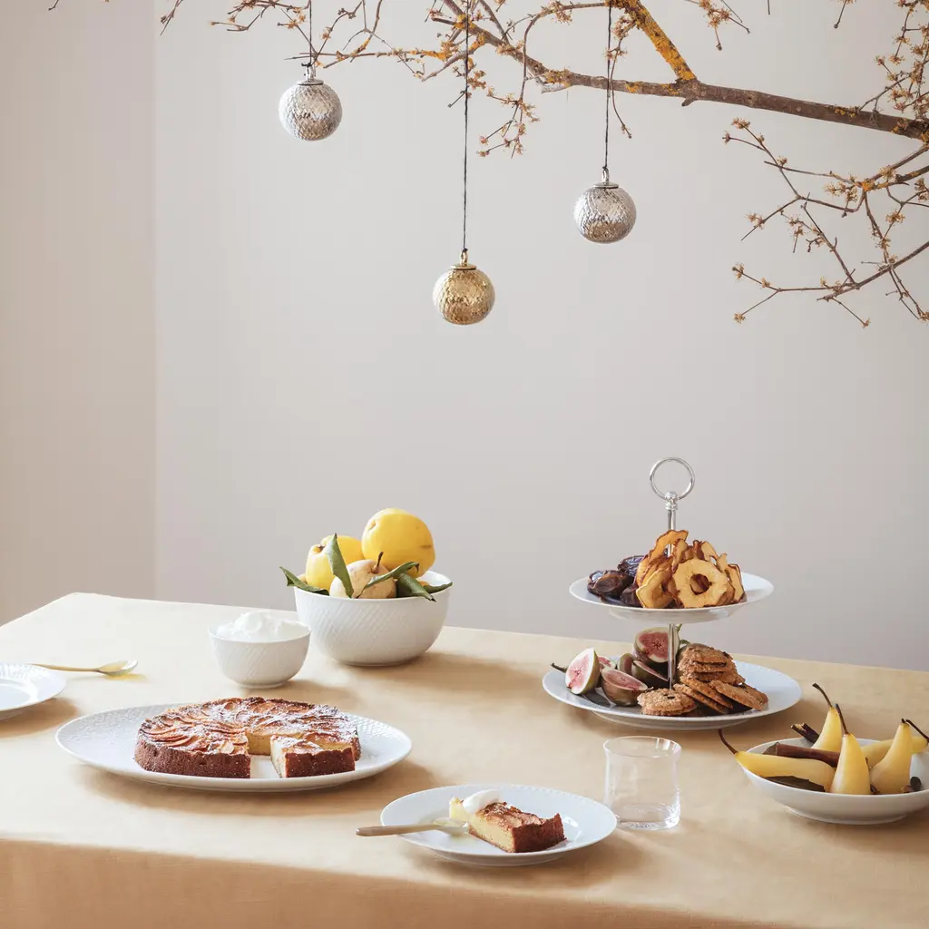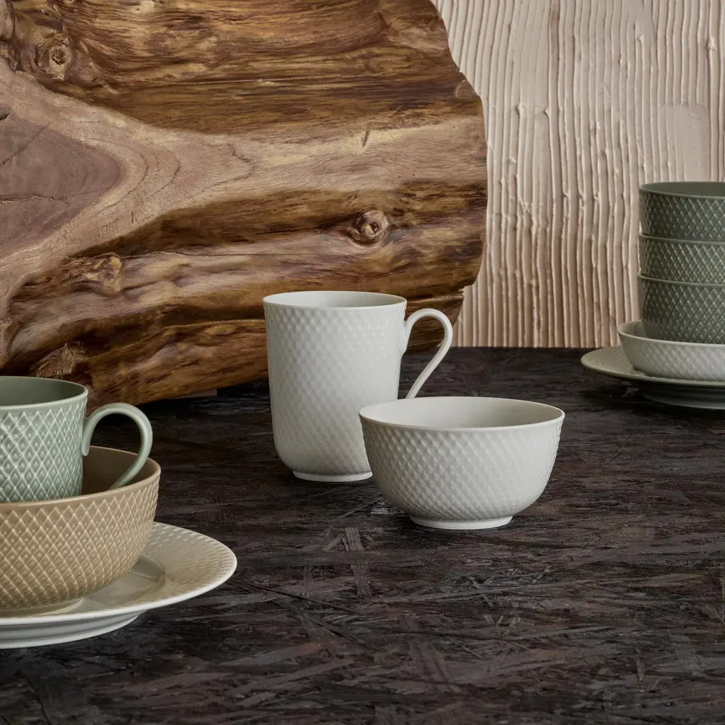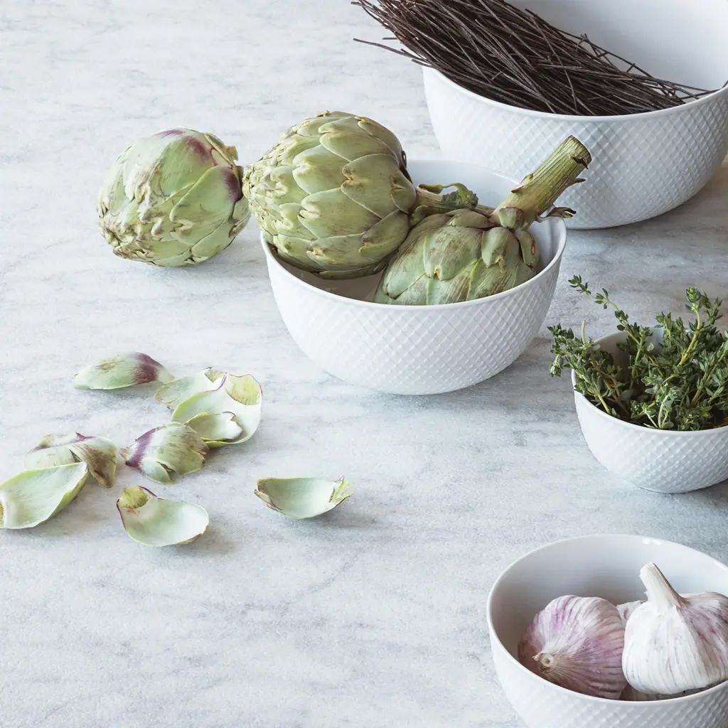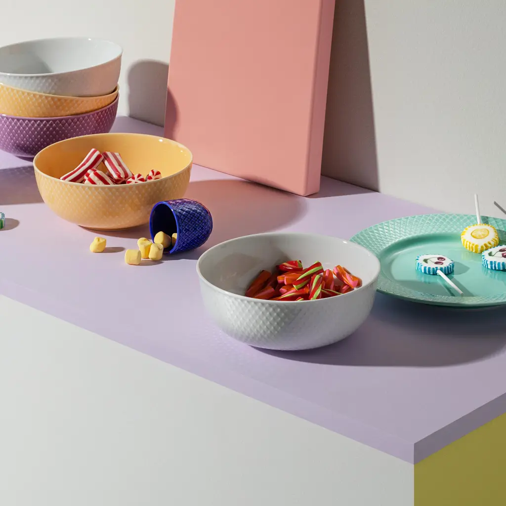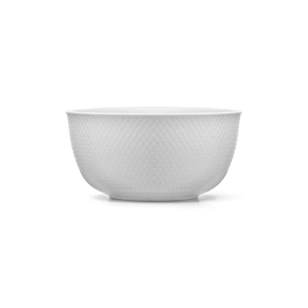 All-white porcelain, quietly patterned. The rhombus relief is pressed into the surface (not printed), so you feel a fine texture when you lift it and see a soft play of light around the rim. Inside, the curve is smooth and open—good for serving, good for spooning the last bit out without chasing it into a corner. The straight sides stack cleanly and don’t eat shelf space. It’s the kind of bowl that disappears just enough to let the food do the talking. Pick the scale that fits the moment: 4.3″ works for olives, nuts, or a pinch bowl; 5.1″ takes berries or yogurt; 6.9″ is right for sides and tossed greens; 8.7″ handles shared salads, pasta, or fruit on the counter. White reads calm on its own and pairs easily with Rhombe Color—the shared geometry keeps a mixed table looking intentional. Glazed porcelain. Dishwasher and microwave safe. Designed by Lyngby Porcelæn from an archive motif reinterpreted in tactile relief.