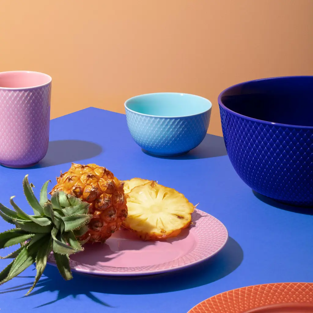 Rhombe Color gives Lyngby’s archive pattern a fresh, saturated glaze. Designed with the Copenhagen duo Stilleben, this small bowl carries the crisp rhombus relief across a glossy color field, so the texture reads even at a glance. It’s the right size for olives, dips, berries, or a single scoop of ice cream—and it stacks neatly with the rest of the series. Mix it with white Rhombe pieces or build a table from color alone; the palette is made to be combined without fuss. The pattern comes from Lyngby’s 1960s design archive, reworked into a contemporary relief that’s tactile and durable for daily use. Available in Green, Rose, Turquoise, and Yellow.