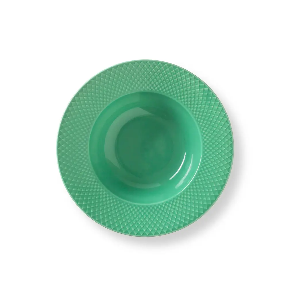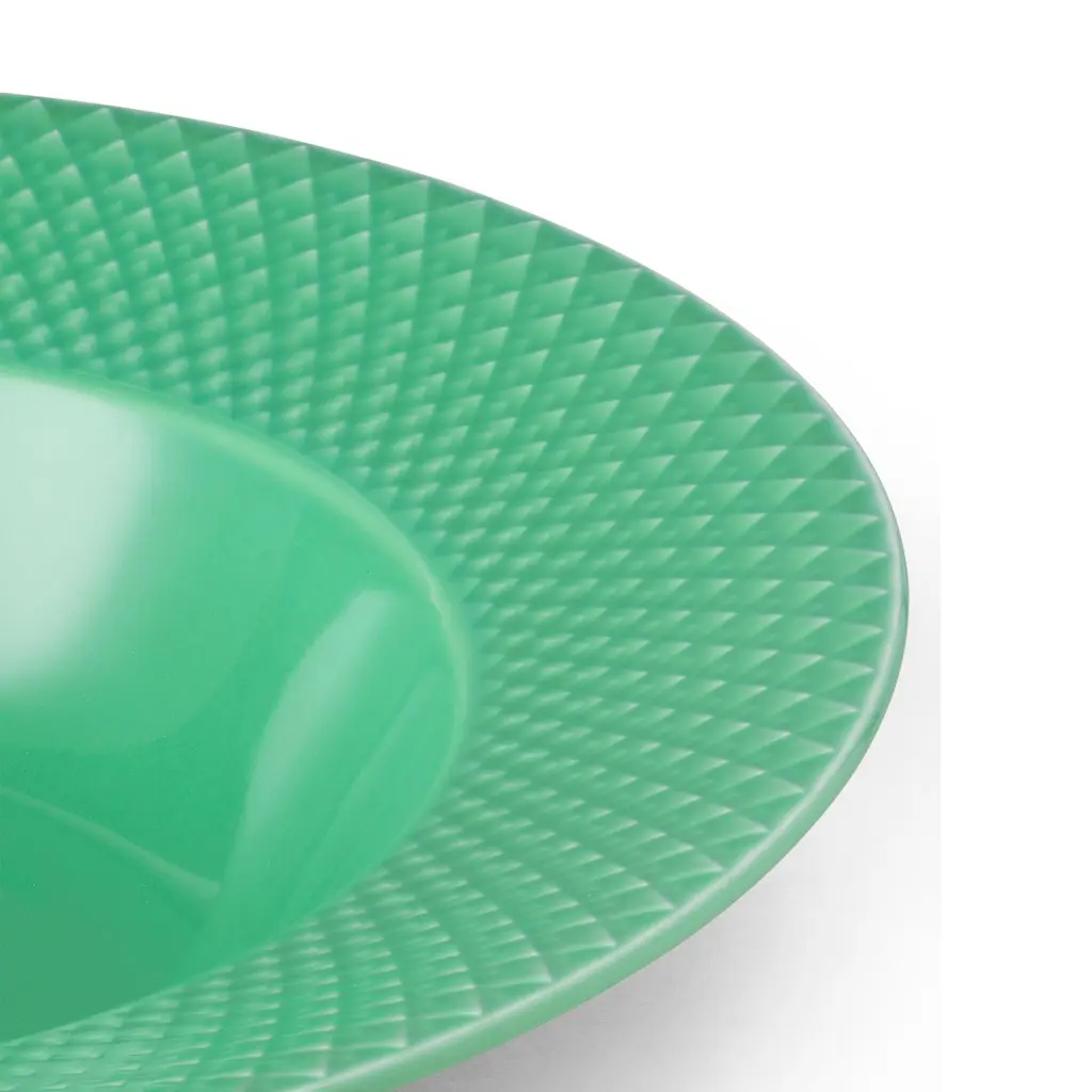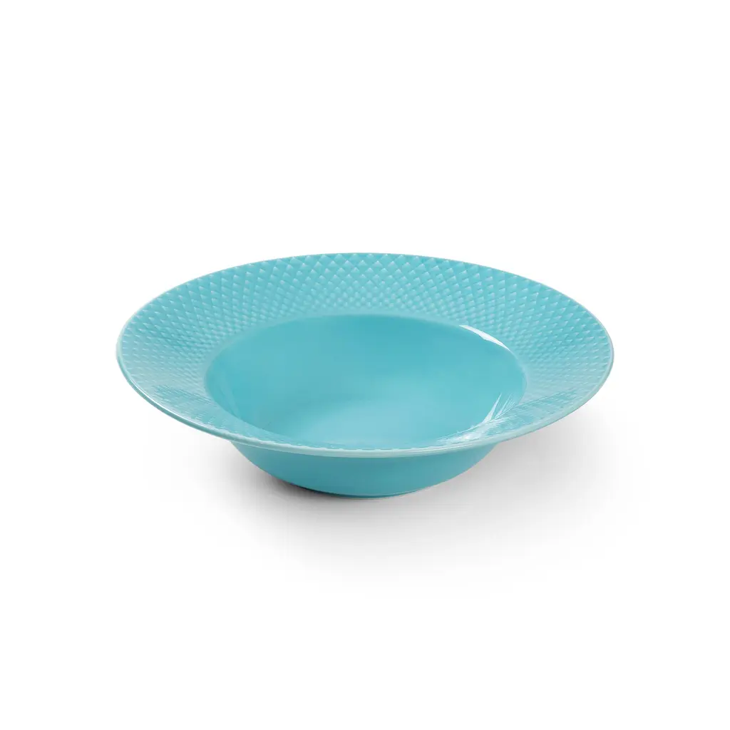 The Rhombe Color soup bowl takes Lyngby Porcelæn’s archival rhombus relief and gives it a new context. The raised pattern wraps the wide rim, catching light and shadow, while the deep center is sized for soups, stews, or pasta. The series was developed with Copenhagen design studio Stilleben, who rethought the classic porcelain form in contemporary tones. Here, the bowl comes in turquoise or green—colors strong enough to stand on their own, but also meant to mix easily with the rest of the Rhombe line.