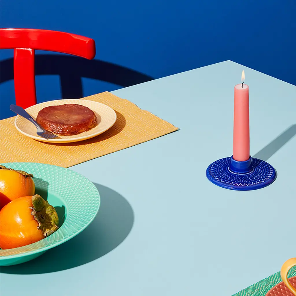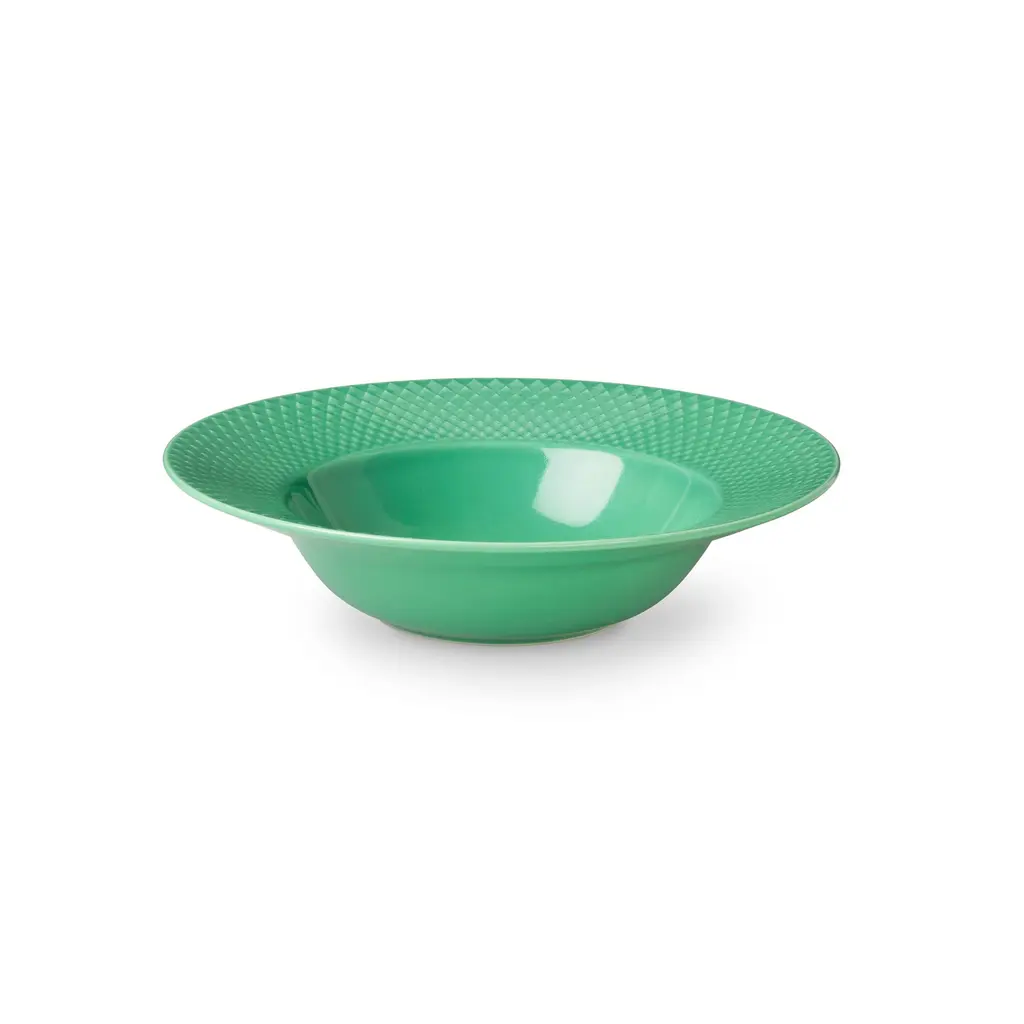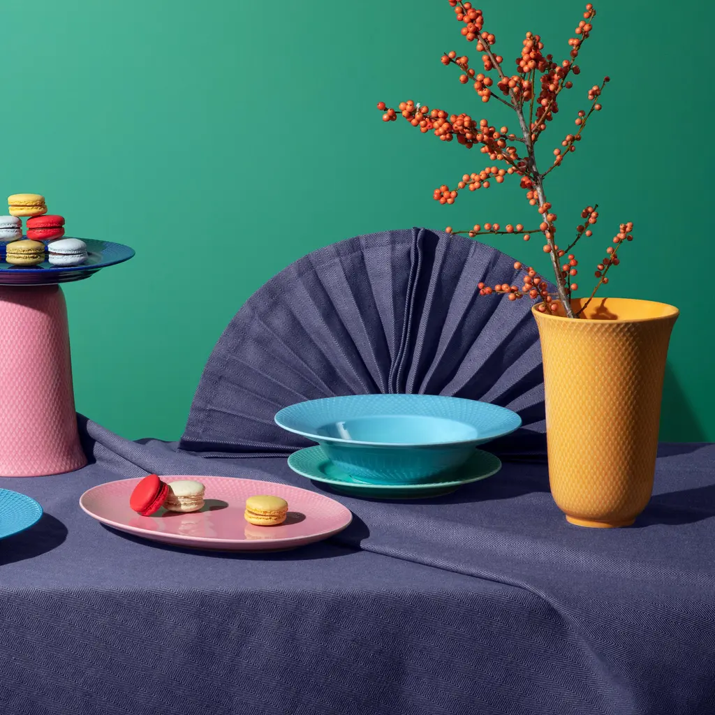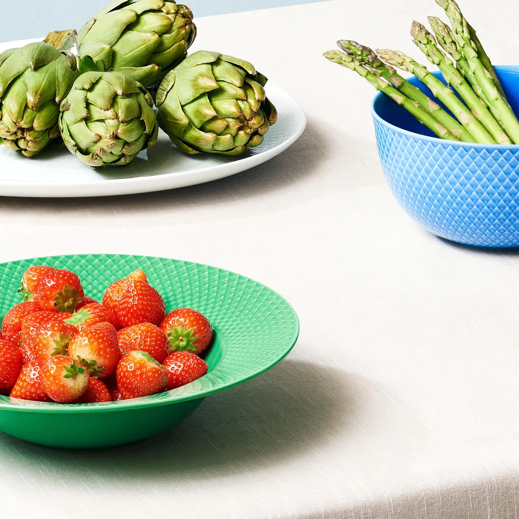 The Rhombe Color soup bowl takes Lyngby Porcelæn’s archival rhombus relief and gives it a new context. The raised pattern wraps the wide rim, catching light and shadow, while the deep center is sized for soups, stews, or pasta. The series was developed with Copenhagen design studio Stilleben, who rethought the classic porcelain form in contemporary tones. Here, the bowl comes in turquoise or green—colors strong enough to stand on their own, but also meant to mix easily with the rest of the Rhombe line.