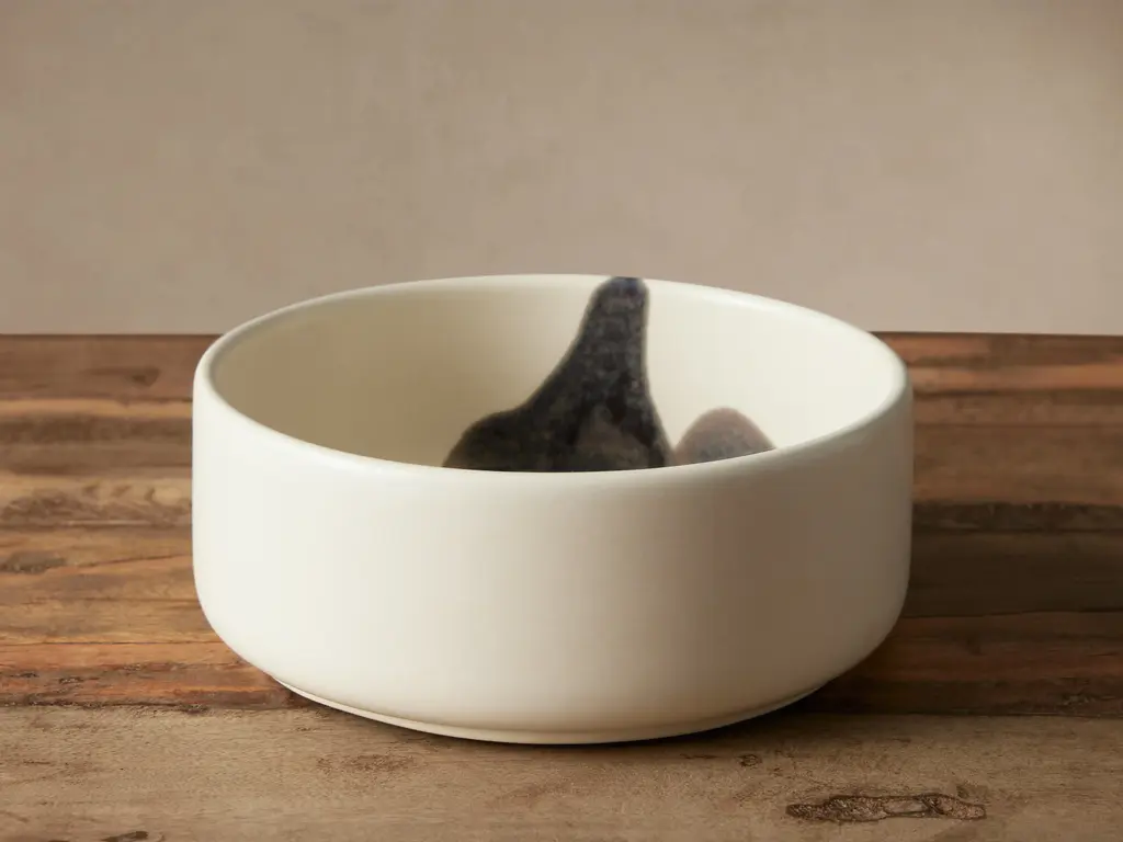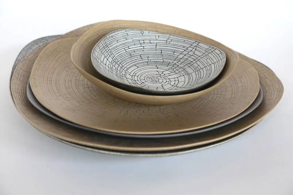 Italian handmade ceramic bowls in crackled birch / grey and sand / tan by Rina Menardi. Priced individually. Available in solids and other colors. Sand color no longer available. Made to order. Shipping from Europe not included.Triangular soup plate in sand - $175Triangular bowl in sand - $145Triangular bowl in birch - $145.