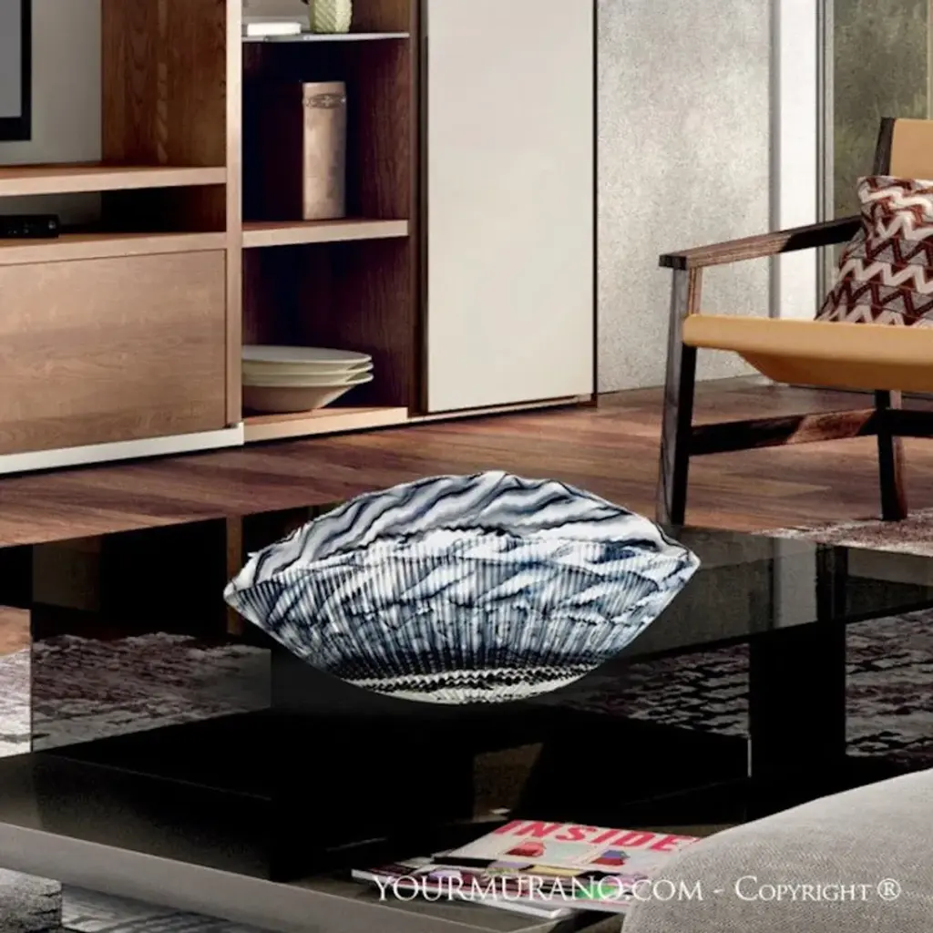 RIO is a contemporary Murano glass decorative bowl, realized with black inlays and mother of pearl effect. Imagine this unique centerpiece in your living room!Whether you are looking for an elegant object to decorate your dining room or for an original glass gift idea to impress someone, these decorative bowls in Venetian glass are an ideal solution. Find the perfect match for your home to create a one-of-a-kind interior design style to let anyone speechless! All products are handcrafted and prime production quality. Insubstantial variations in shape, size, colour, small imperfections and/or tiny air bubbles in the glass are not considered defects; they are inevitable and are typical of manual production of the glass and characterize handcrafted production.