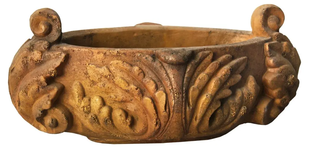 This green speckled patina is highlighted with gold leaf designs in a traditional leaf pattern. The 14.5" diameter and 7.5" height makes this bowl with handles the perfect balanced accessory.