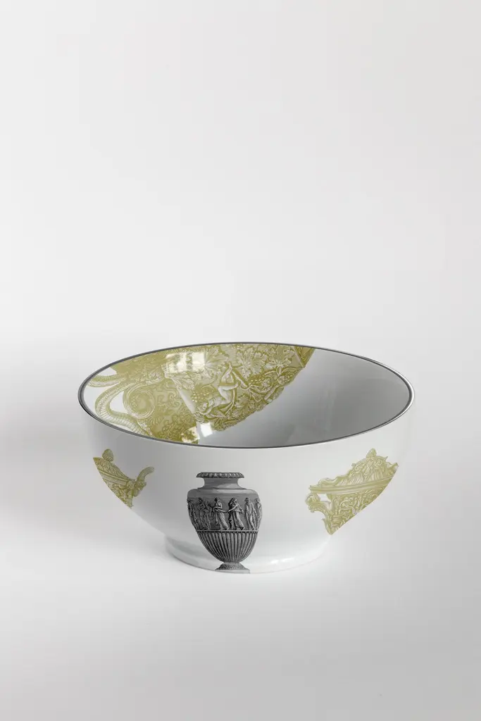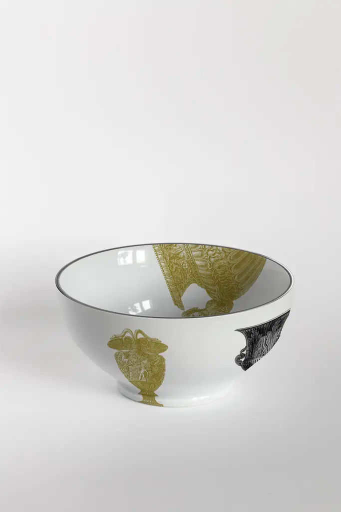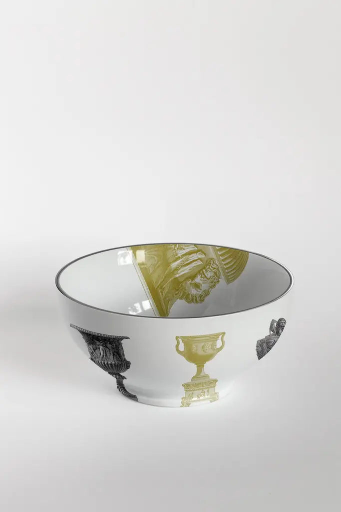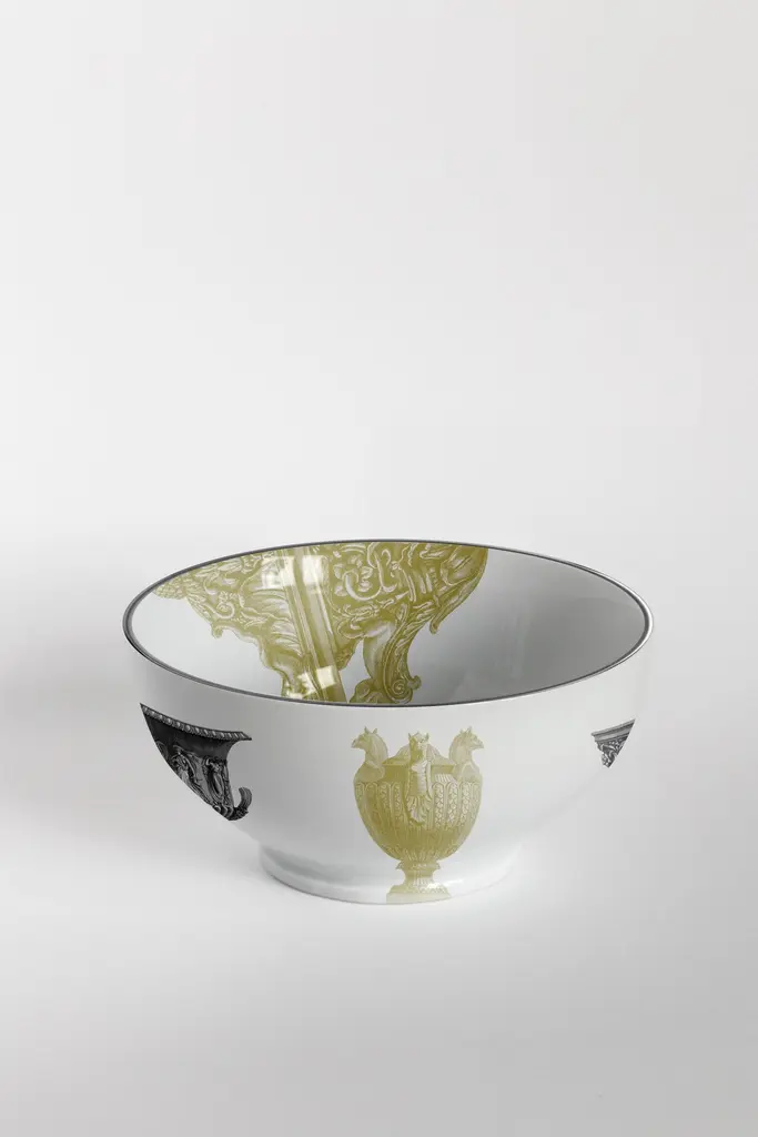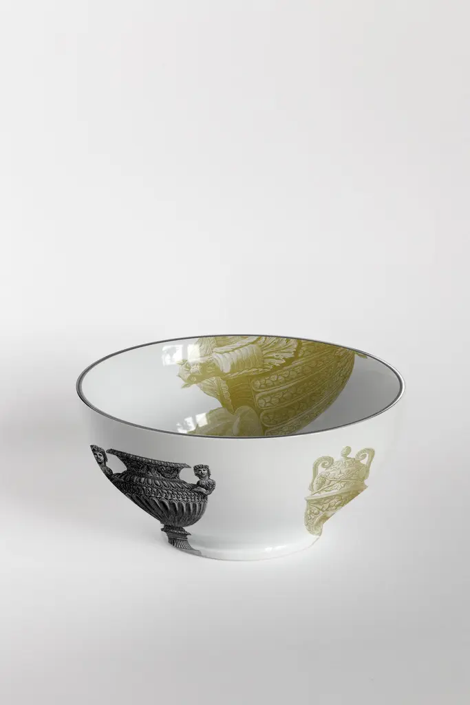 La collezione Roma è un'ode alla magnificenza della città eterna. Sullo sfondo dei piatti che raffigurano serigrafie di alcuni dei luoghi più iconici della città - come il Pantheon e il Colosseo - spiccano illustrazioni antiche di vasi, anfore e brocche riccamente decorate. I toni del giallo in contrapposizione con il nero rendono questo set elegante e ricercato, perfetto sia come alemento di decoro che come mise en place.set di 6 ciotole.