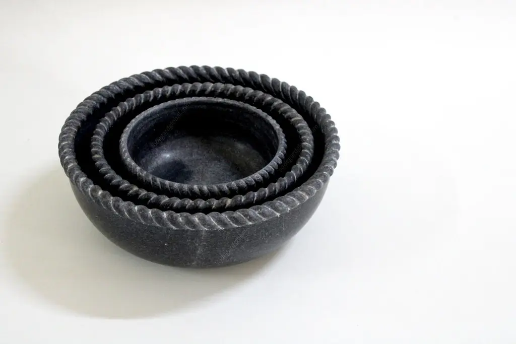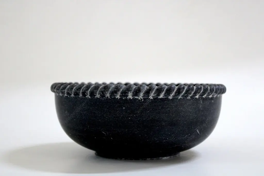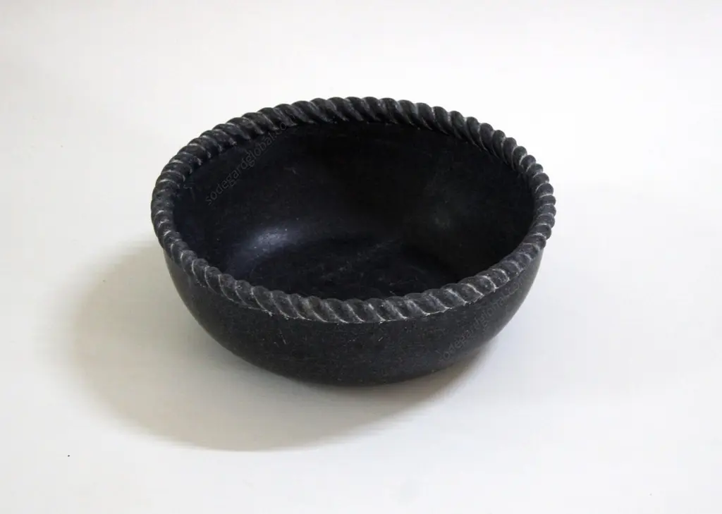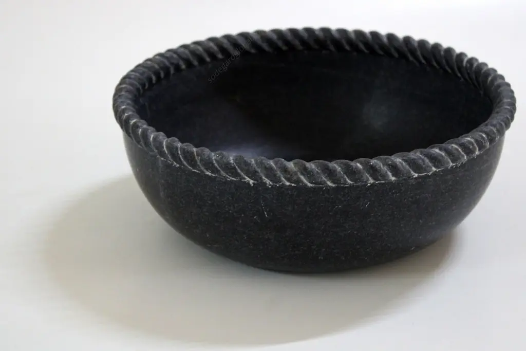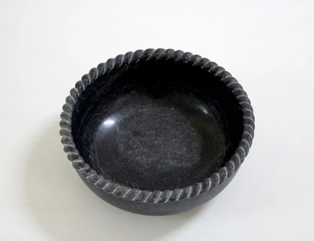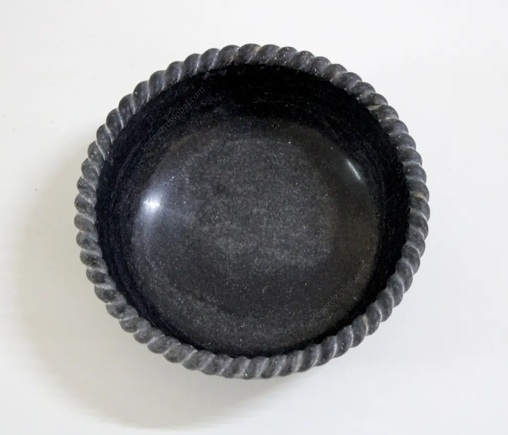 Sculpted out of a single block of marble with a delicately carved rope edge, perfect for a potpourri, a fruit bowl or just a key catch.Round Rope Bowl in Black MarbleSize- 8.5” x 8.5” x 3.5” H.Materials - Black Marble, Hand-CarvedBuyer Cancellation-The cancellation charge is 25% which increases to 50% if the production is started.Prices do not include shipping from India (for custom orders) or our MN warehouse (items from stock). That will be additional.