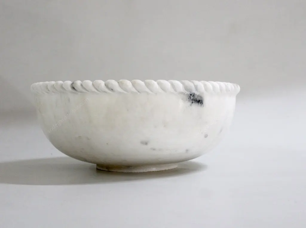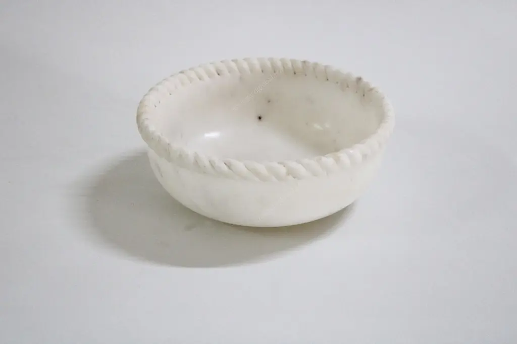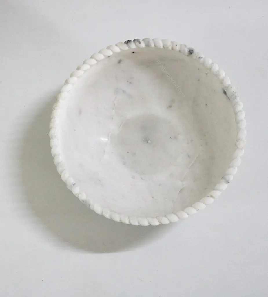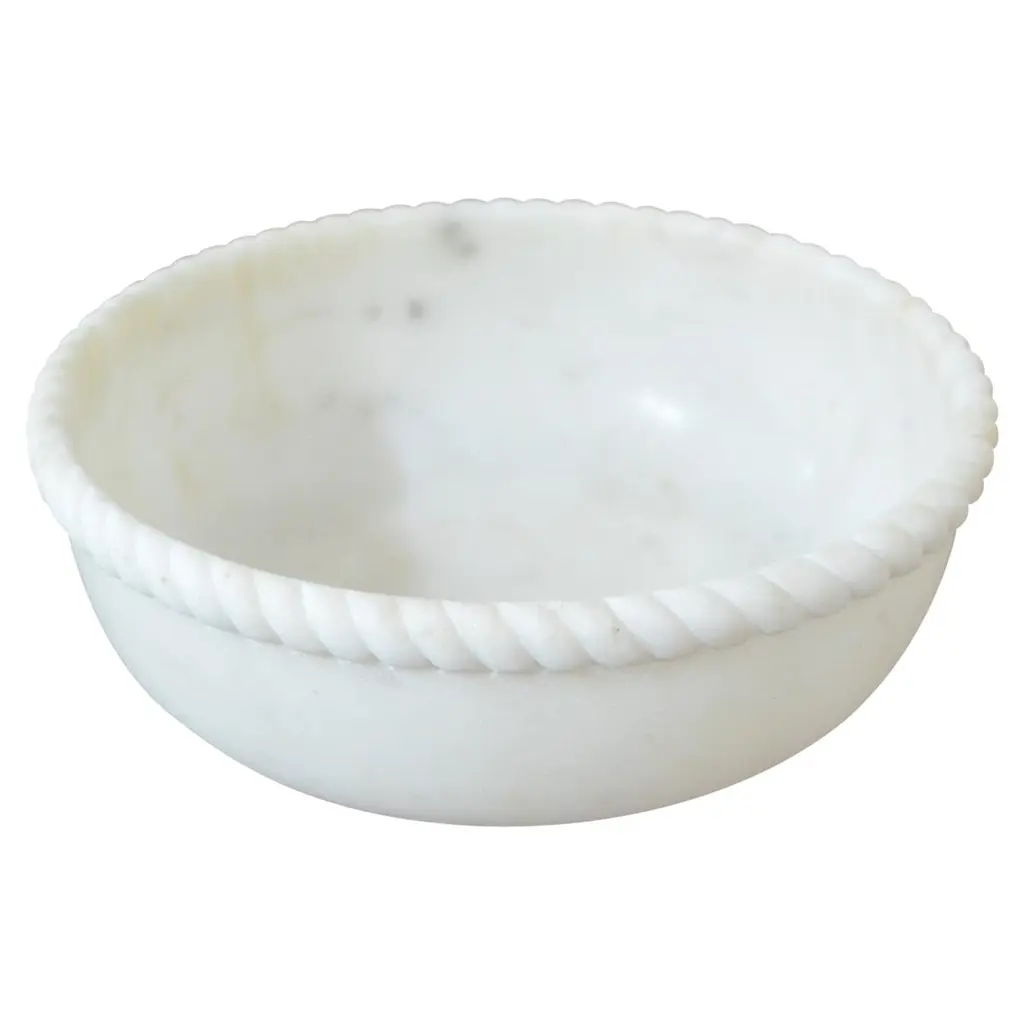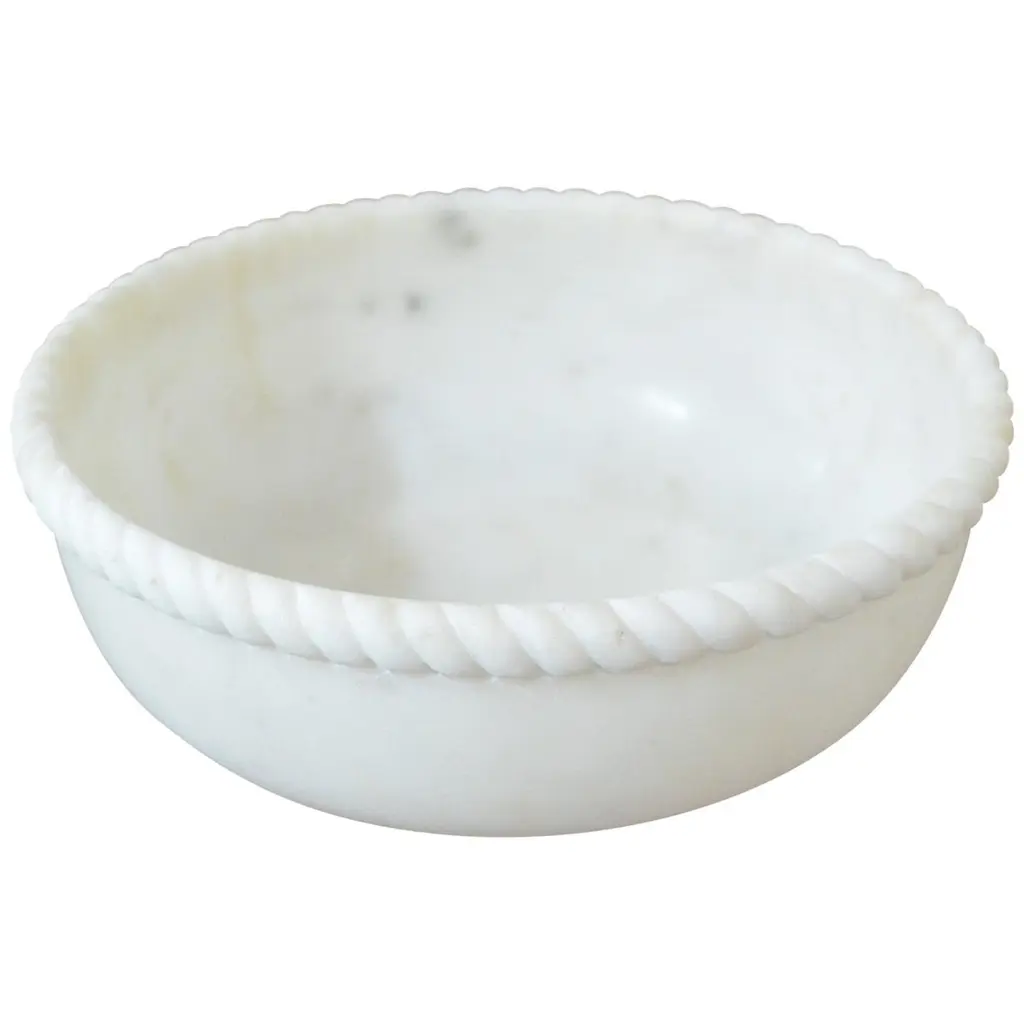 Sculpted out of a single block of marble with a delicately carved rope edge, perfect for a potpourri, a fruit bowl or just a key catch.Rope Bowl in White MarbleSize- 10" x 10" x 4" H.Materials - White Marble, Hand Carved, Semi matt finished.Buyer Cancellation-The cancellation charge is 25% which increases to 50% if the production is started.Prices do not include shipping from India (for custom orders) or our MN warehouse (items from stock). That will be additional.