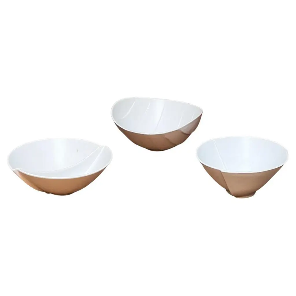 Bowls worthy of a queen. Named in honor of the queen of Denmark, the Margrethe bowls epitomize the beautiful form and function of mid-century Danish design. The warm beige melamine set does double duty as attractive serving bowls and sturdy anti-slip mixing bowls with helpful handles and pouring spouts. Inspired by pebbles gently shaped by the elements, the two rounded bowls pair matte exteriors with shiny interiors. This set cleans up easily in the dishwasher and nests compactly when not in use.