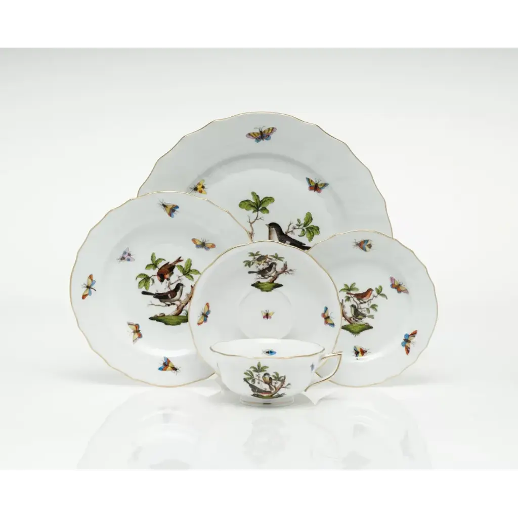 Many connoisseurs consider this pattern, first created in 1860 for the Rothschild family of Europe, to be the epitome of hand painting on porcelain. Twelve different motifs portray a 19th century tale about Baroness Rothschild, who lost her pearl necklace in the garden of her Vienna residence. Several days later it was found by her gardener, who saw birds playing with it in a tree. Hand painted in Hungary. Now the biggest porcelain manufactory in Europe, Herend was founded in 1826 to produce earthenware in the small Hungarian village for which it was named. At the time, Hungary was flooded with low-cost pottery, but in 1839, Mor Fischer became the Manufactory’s new owner and he decided to focus on producing dinnerware replacement pieces for Europe’s royal families to complement their valuable porcelain patterns from Germany and the Far East. As his client base grew, Fischer commissioned his artists to begin designing dinnerware patterns of their own. Queen Victoria’s 1851 purchase of a large set for Windsor Castle was a milestone, setting the stage for aristocrats throughout Europe to clamor for Herend in their estates. In the 1850s, Herend added meticulously-crafted figurines to its creations. Herend’s trademark fishnet pattern, which is widely recognized and prized as Herend’s signature design, started in 1858 when an artist who was intrigued with a Chinese plate’s fish scale design painted it onto a rooster figurine to imitate feathers.