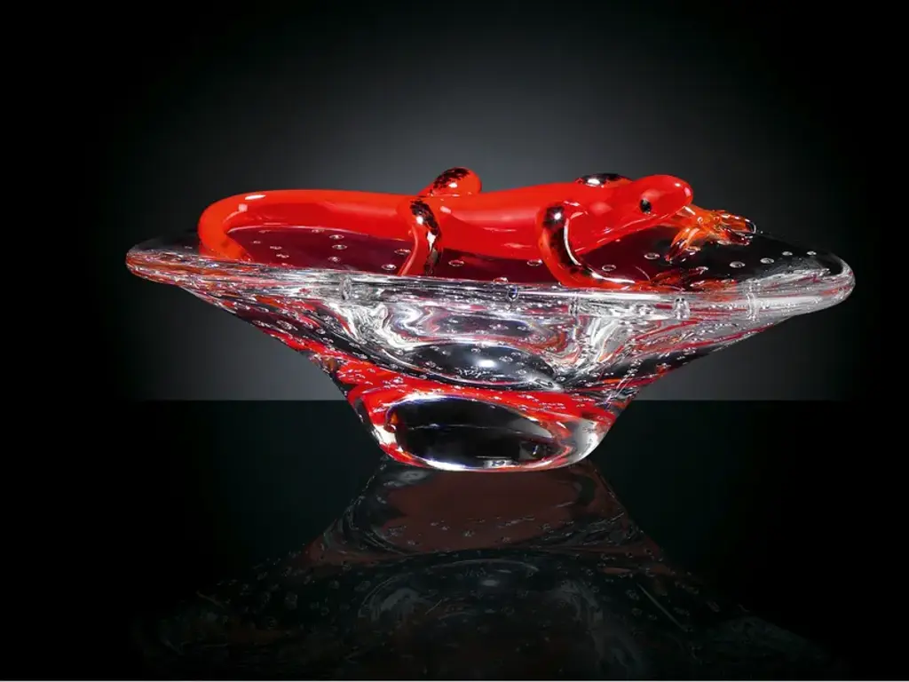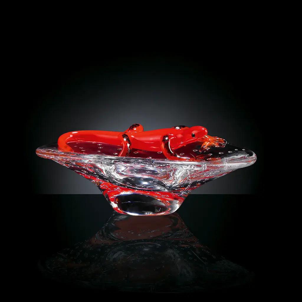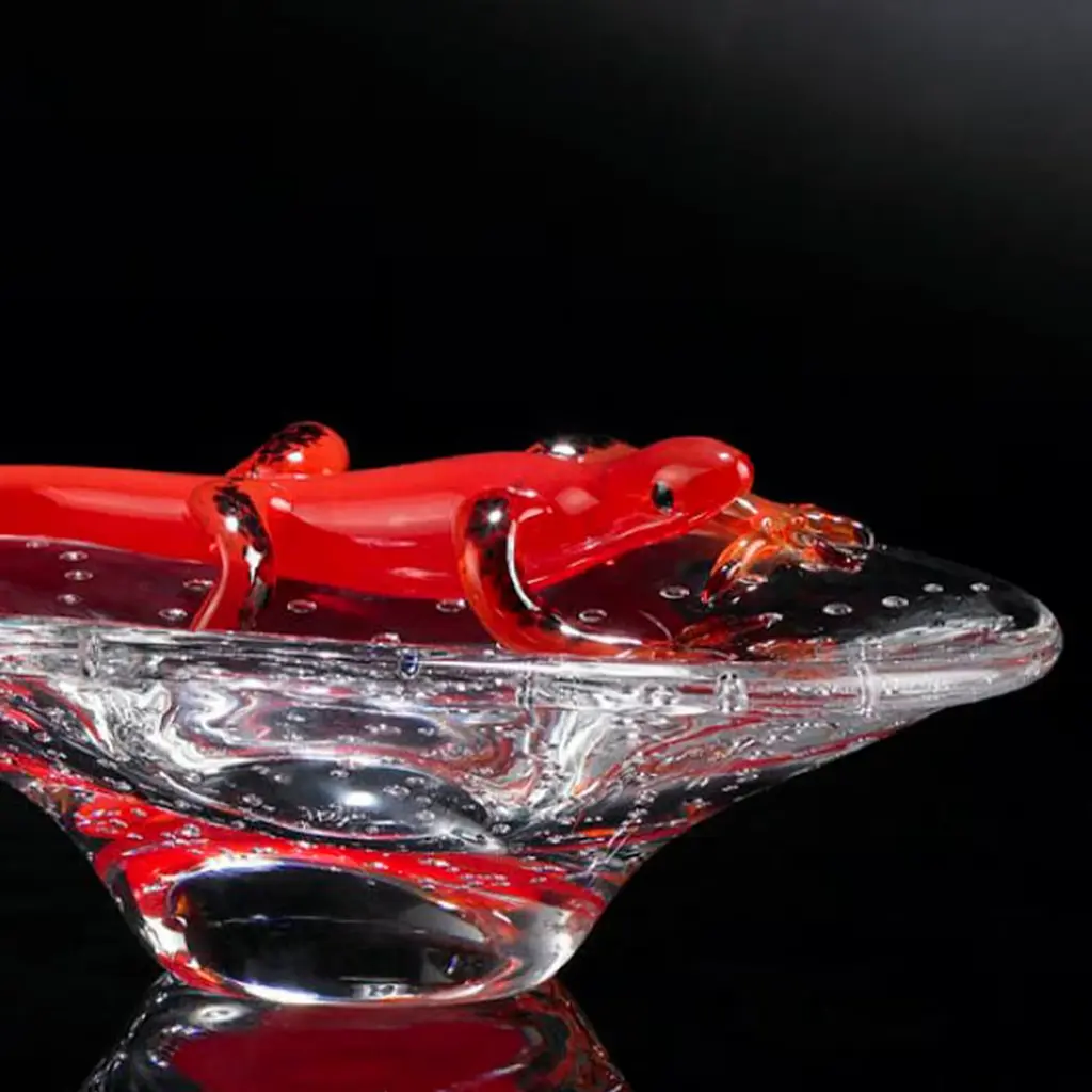 Perfect for adding whimsy to a console, sideboard, or coffee table, this playful bowl can be used all around the home either alone or paired with other pieces from the same series. This refined objet d'art is handcrafted entirely of mouthblown glass and features a red gecko perched on the rim of the fluted, clear glass bowl.