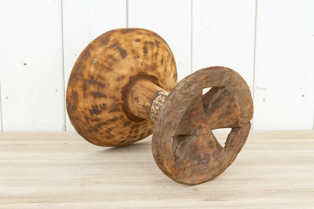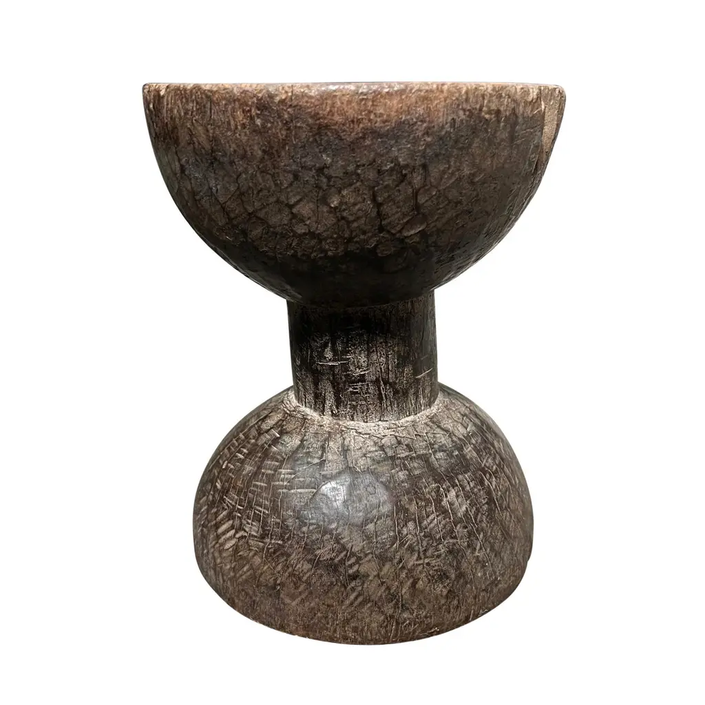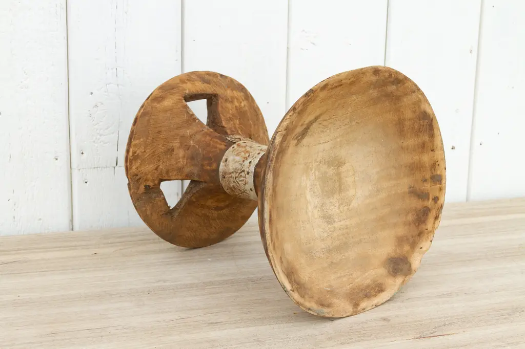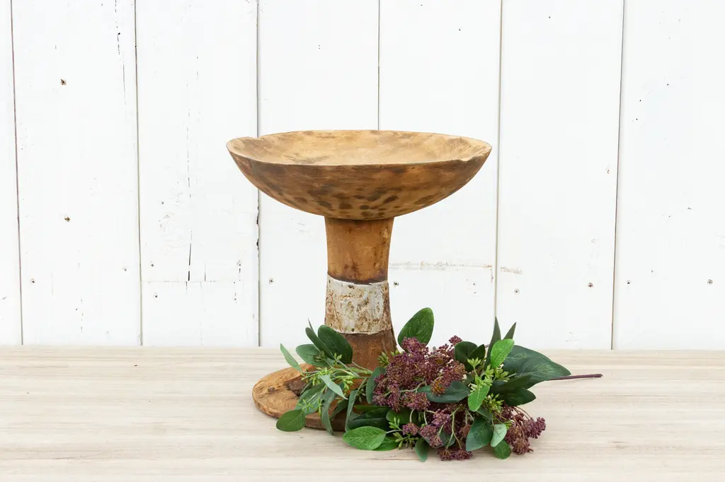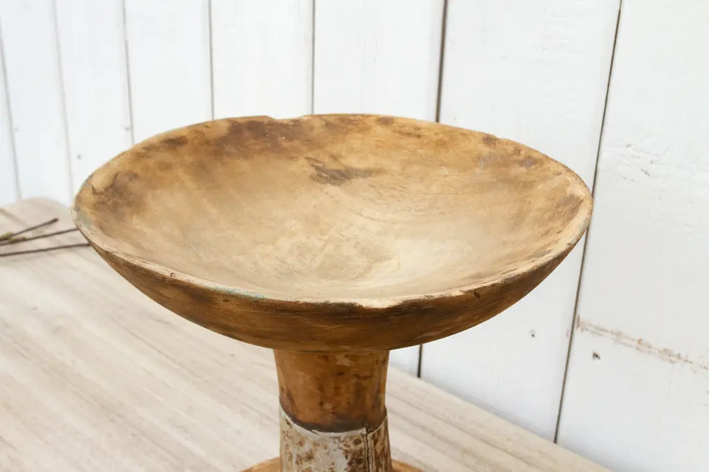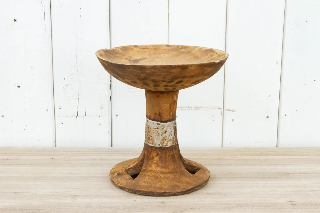 Tribal wooden Naga fruit bowl on a stand. This fruit bowl is hand-carved by the tribes of Nagaland. Fashioned from a single piece of wood and was once used for serving fruits and dry fruits. This bowl would be perfect as a table top accent piece in any decor.