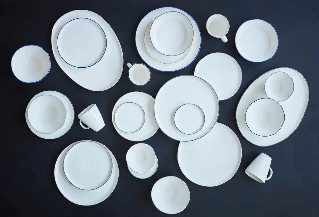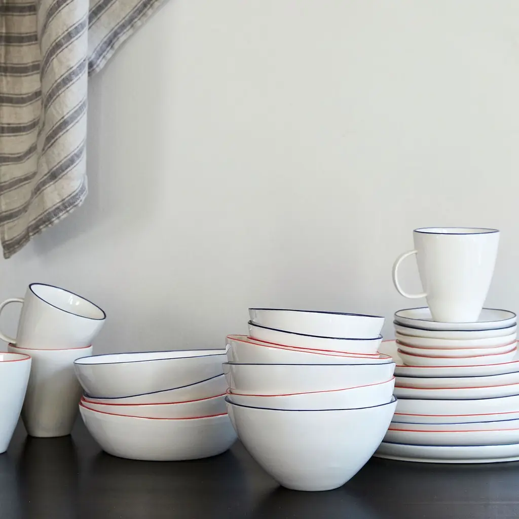 Named a design classic by Elle Décor, this best-selling porcelain dinnerware reflects its European heritage through its understated elegance. A single, hand-painted line outlines the simple, organic shapes. Available with various rim colors. Porcelain. Microwave and Dishwasher Safe (certain rims cannot be microwaved). Set of 2.