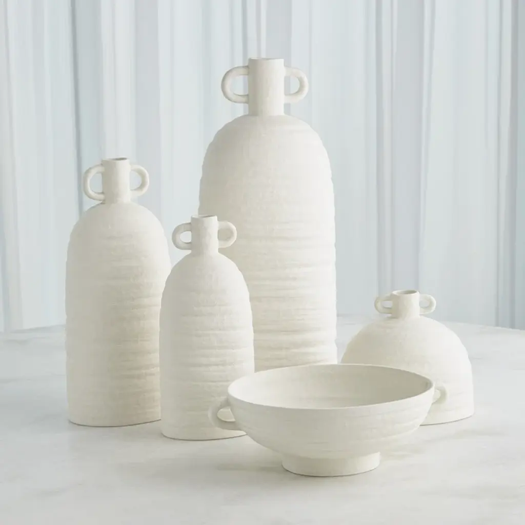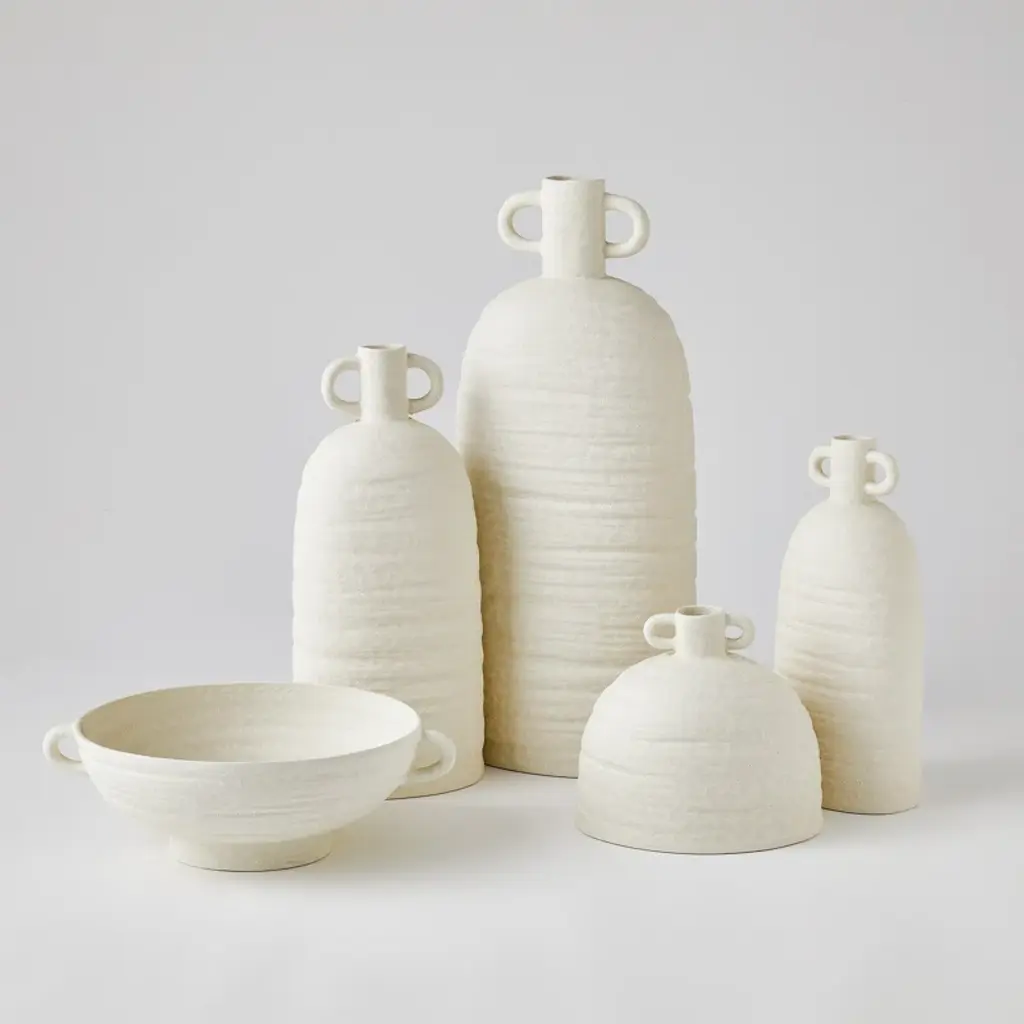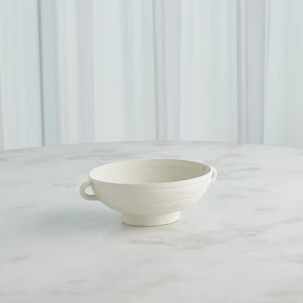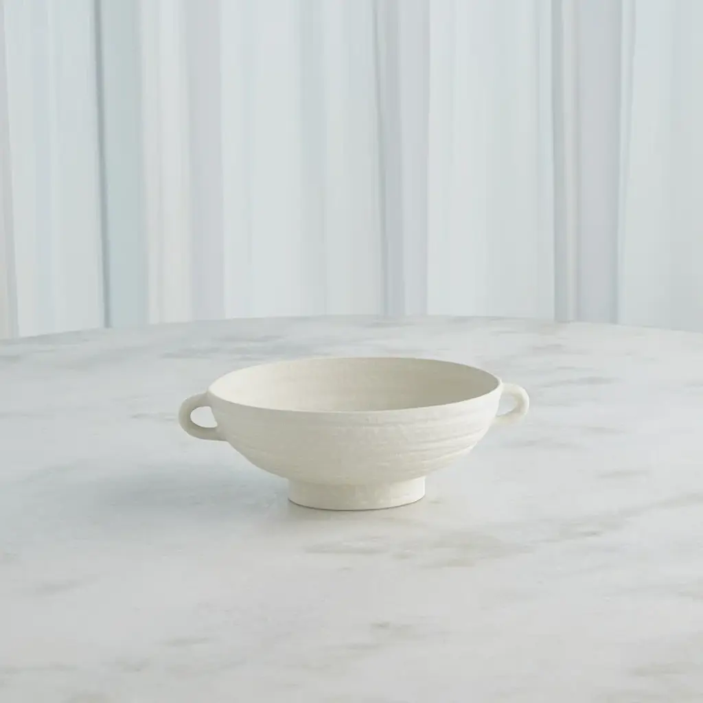 Hand-thrown and perfectly imperfect, this terracotta bowl brings the character. With subtle horizontal ribbing that shows through the white uneven gray-blue glaze, It makes a lovely accent tucked in a bookshelf, or featured on a mantle or console.