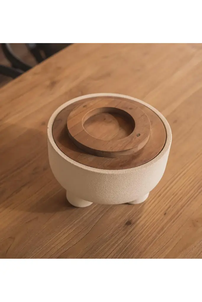 The Elin Bowl range is a deep bowled, one-piece, pale local Java sand stone form, hand crafted by dBodhi artisan masons. The Elin bowl is topped by a beautifully carved and turned, reclaimed teak lid, exposing the X/O concept design feature of the letter O.