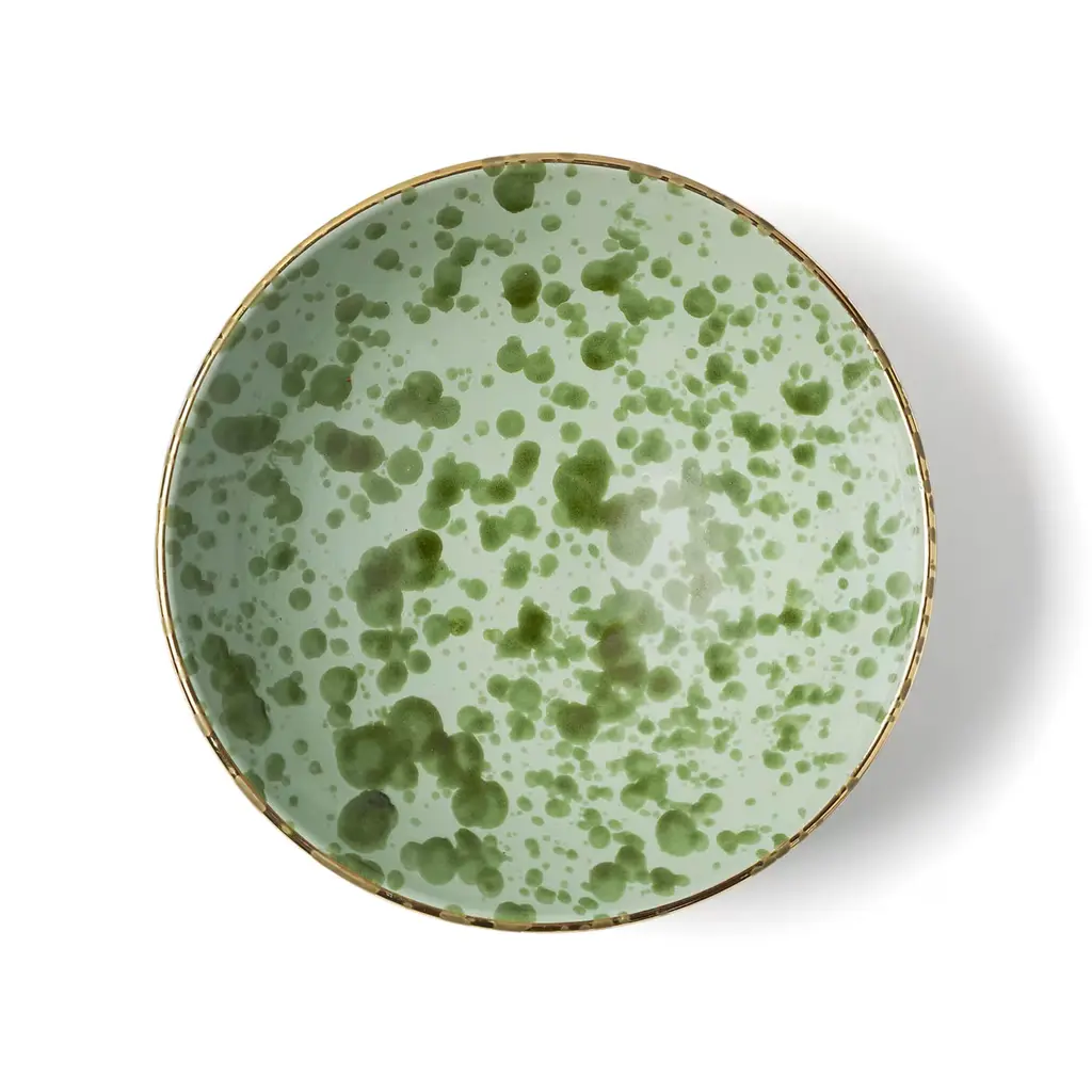 Each piece of this exquisite set features a unique hand-applied sponge pattern, ensuring that no two bowls are exactly alike. A luxurious gold rim adds a touch of elegance, enhancing the allure of these striking items. Perfect for serving salads, snacks, or as decorative centerpieces, these bowls embody both artistry and functionality. These pieces are ideal to make a statement in home decor.