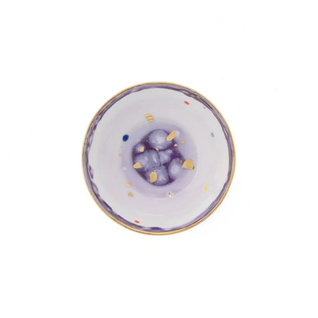 Luxurious and cheerful, the Florida collection was launched in 2023. It is inspired by the American state famous for its strong character and colorful heritage. Each line is characterized by a color. They are inspired by some of the most famous places in Florida, recalling its beaches and its sunsets, stretching between the Gulf of Mexico and the Atlantic Ocean.Palm Beach pink, Miami orange, Amelia green, Naples yellow, Crystal tourqoise, Islamorada lavender.Each plate is decorated with a lightly colored center interspersed with multicolor dots. The rim is richly decorated golden leafs. The charger, tea and coffee cups have are decorated with a golden net- The dessert plates and teapots have a distinct design characterized by golden rays crisscrossing their surface.