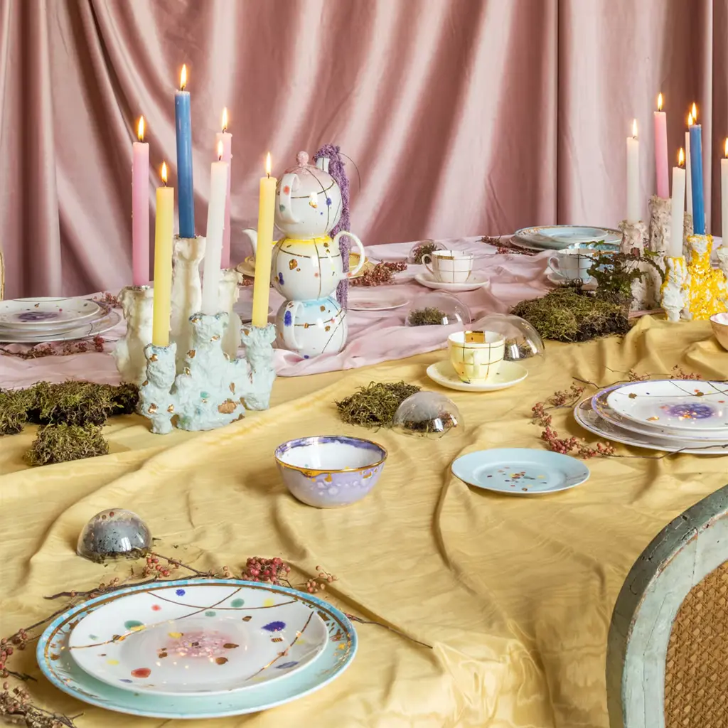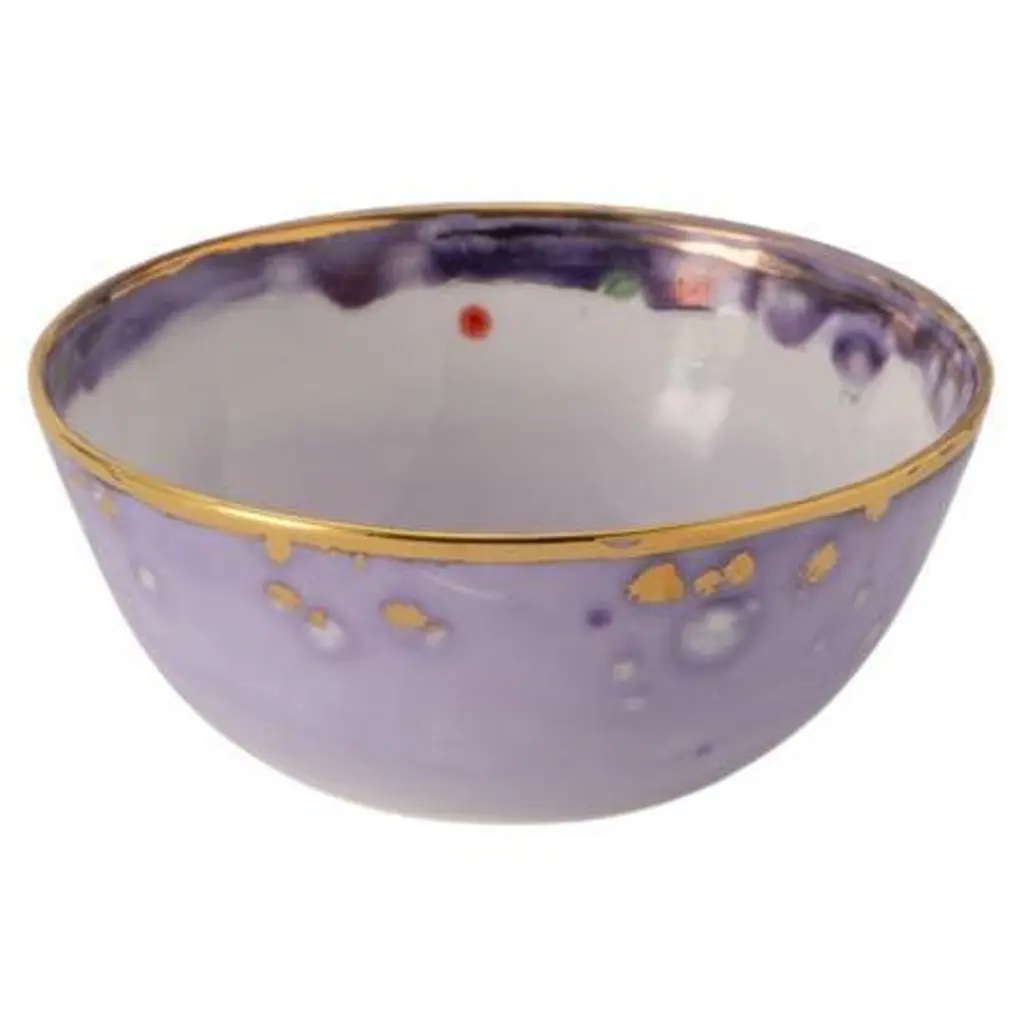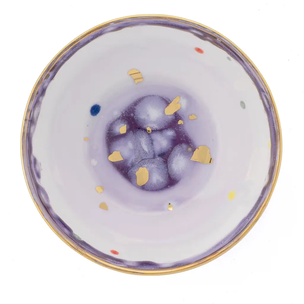 This Fruitbowl from the Florida collection, launched in 2023, beautifully captures the essence of luxury and cheer. Inspired by Florida's vibrant character, this pieces feature a soft Islamorada lavender that evokes the tranquility of its sunsets and serene beaches. It is adorned with a lightly colored center, playfully sprinkled with multicolor dots, adding a whimsical touch. The elegantly finished rim, richly decorated with golden leaves, enhances their sophistication.