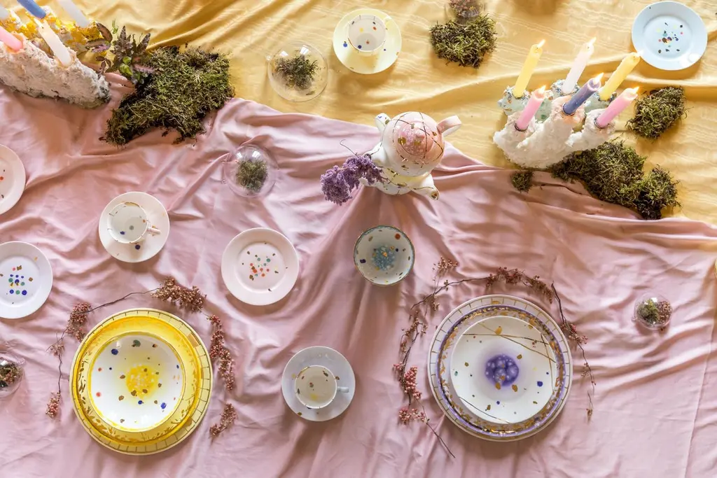 Luxurious and cheerful, the Florida collection was launched in 2023. It is inspired by the American state famous for its strong character and colorful heritage. Each line is characterized by a color. They are inspired by some of the most famous places in Florida, recalling its beaches and its sunsets, stretching between the Gulf of Mexico and the Atlantic Ocean.Palm Beach pink, Miami orange, Amelia green, Naples yellow, Crystal tourqoise, Islamorada lavender.Each plate is decorated with a lightly colored center interspersed with multicolor dots. The rim is richly decorated golden leafs. The charger, tea and coffee cups have are decorated with a golden net- The dessert plates and teapots have a distinct design characterized by golden rays crisscrossing their surface.