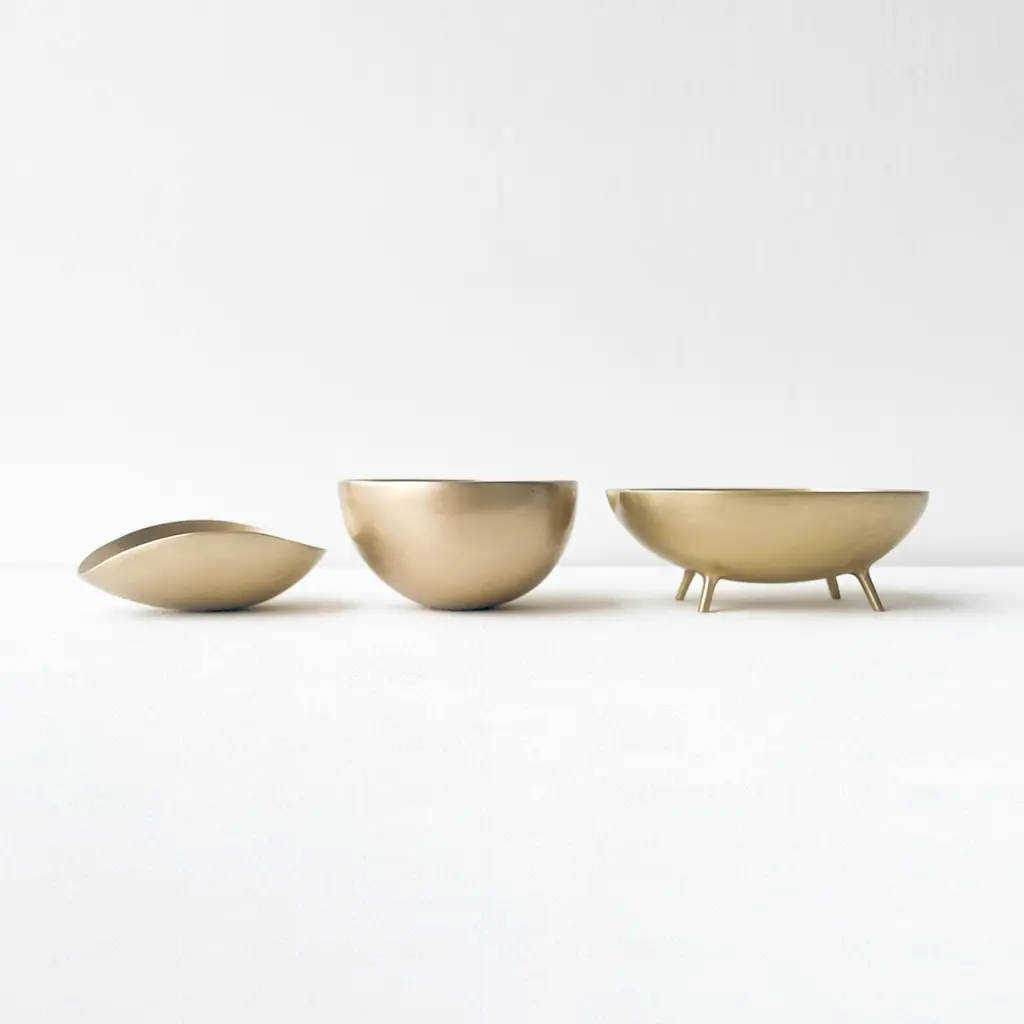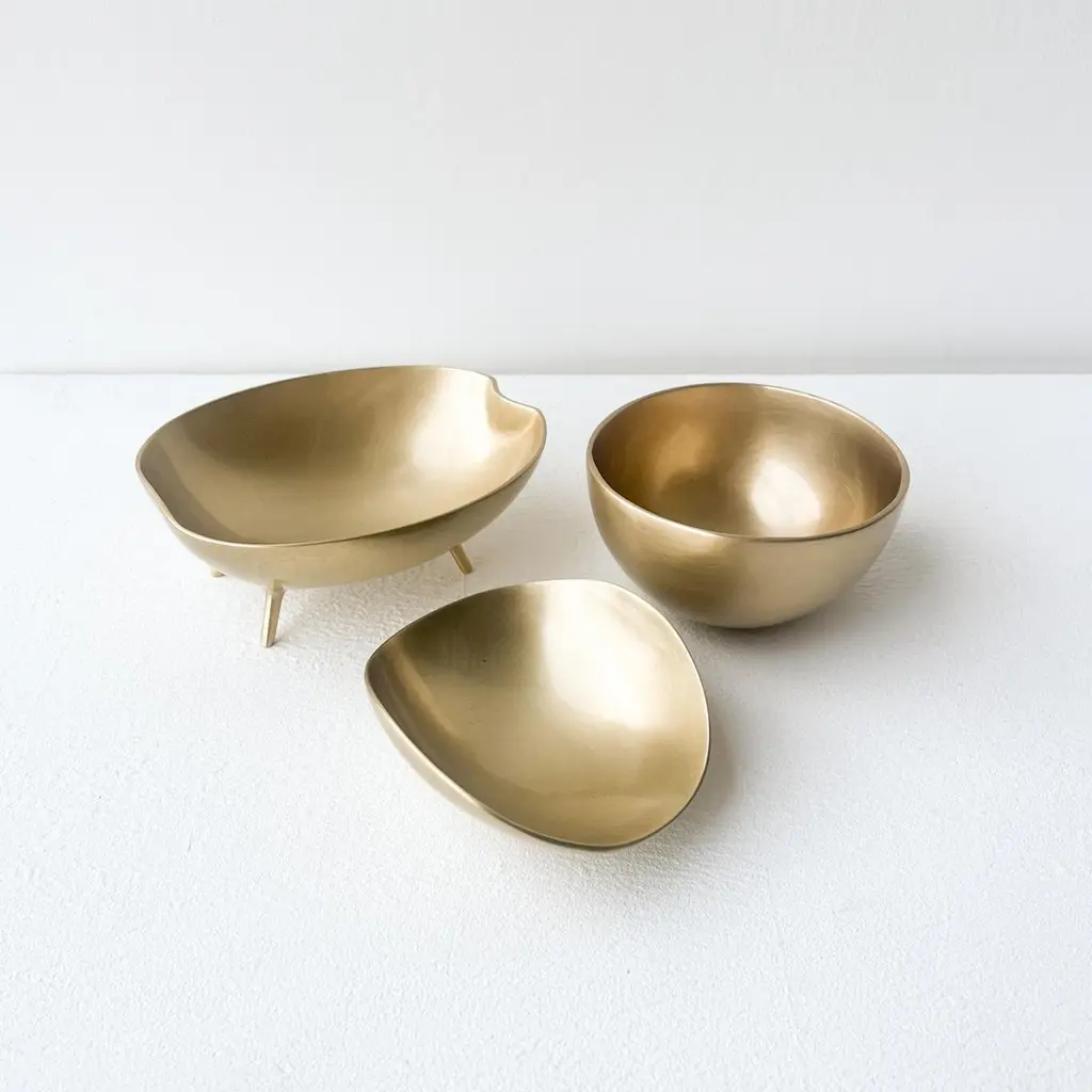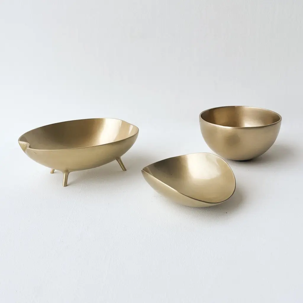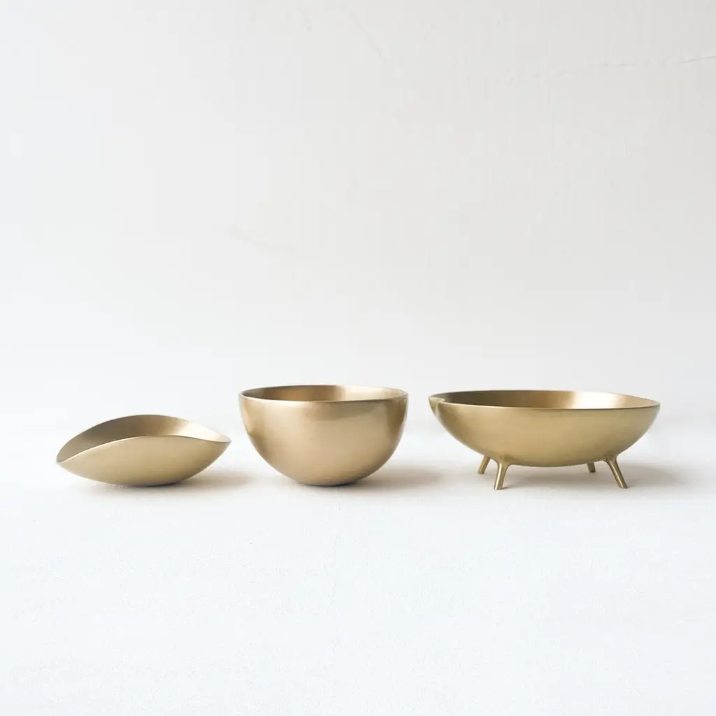 Set of three mixed handmade brushed cast brass decorative bowls.Each of those original and elegant bowls are handmade individually. Cast using very traditional techniques.Slight variations in patterns and sizes are characteristics of such original handmade creations. These characteristics enhance the beauty of the product and make each piece unique.Brass Bowl with Legs: H 6 cm x W 12 cm x D 14 cm / H 2.37 in x W 4.73 in x D 5.52 inBrass Irregular Shallow Bowl: H 4.5 cm x W 11 cm x D 10 cm / H 1.78 in x W 4.34 in x D 3.94 inSmall Brass Bowl: H 6 cm x W 11 cm x 10.5 cm / H 2.37 in x W 4.34 in x D 4.14 inORDERS OF MULTIPLE ACCESSORIES OF THE SAME TYPE: Please contact us to receive a Packing and Shipping quote when ordering multiple accessories of the same type. An order for multiple accessories of the same type may not be accepted without extra packing and shipping fees. Thank you.