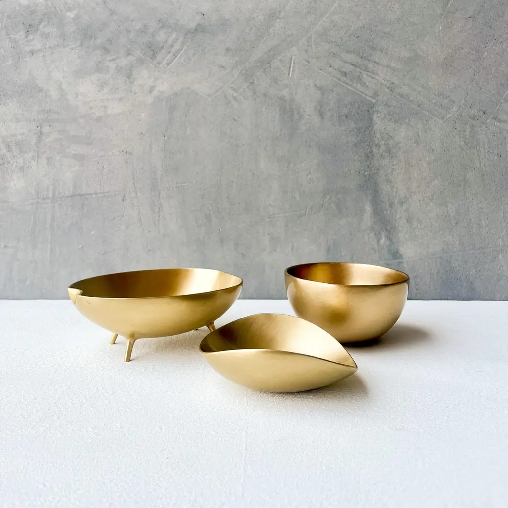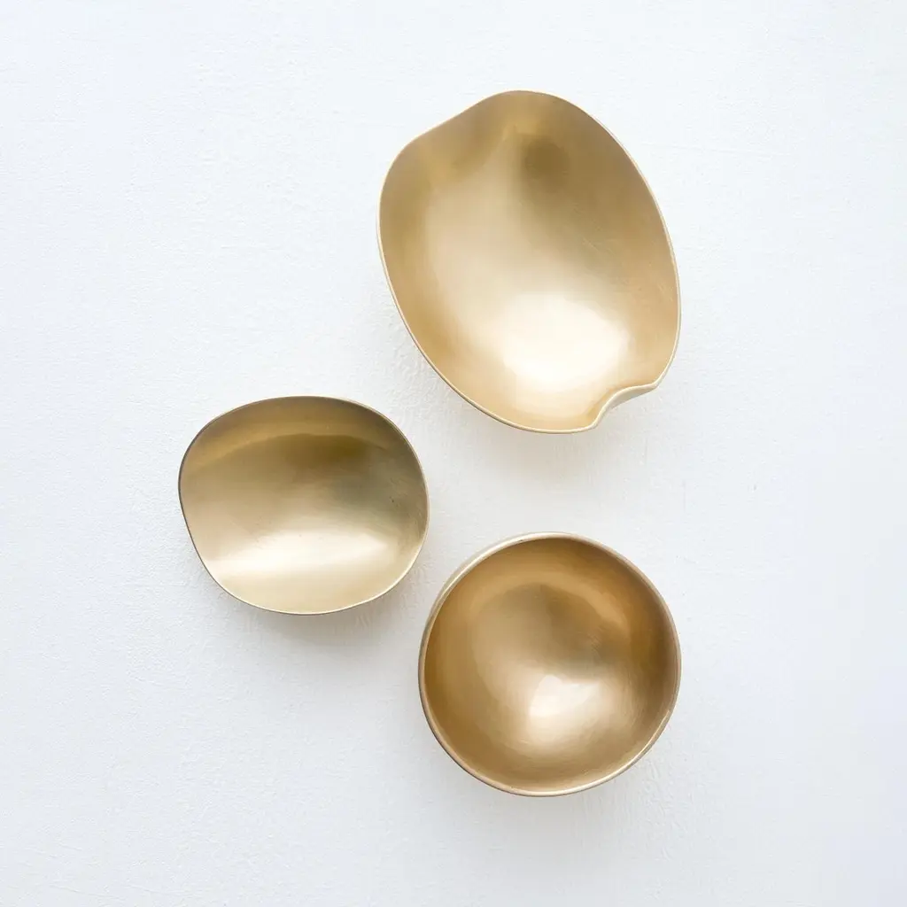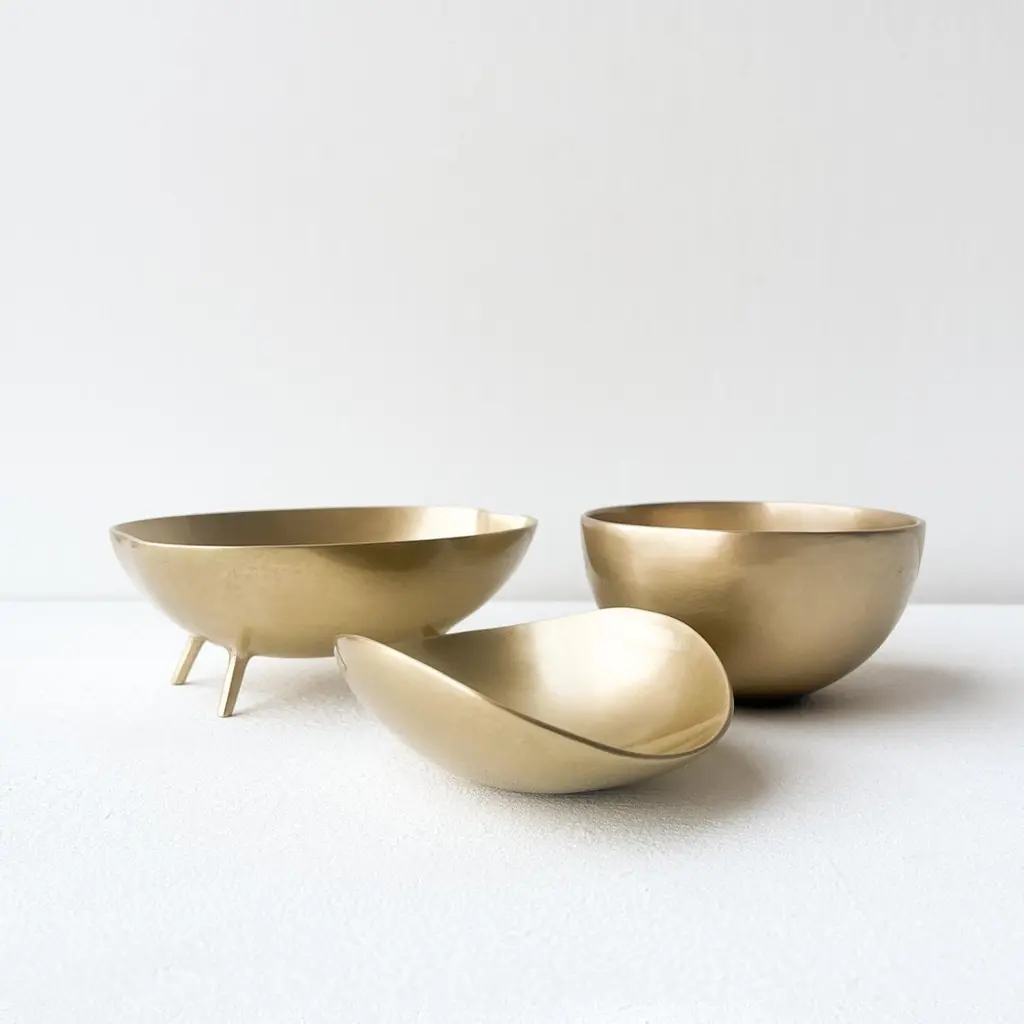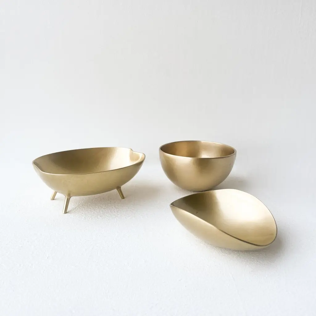 Set of three mixed handmade brushed cast brass decorative bowls.Each of those original and elegant bowls are handmade individually. Cast using very traditional techniques.Slight variations in patterns and sizes are characteristics of such original handmade creations. These characteristics enhance the beauty of the product and make each piece unique.Brass Bowl with Legs: H 6 cm x W 12 cm x D 14 cm / H 2.37 in x W 4.73 in x D 5.52 inBrass Irregular Shallow Bowl: H 4.5 cm x W 11 cm x D 10 cm / H 1.78 in x W 4.34 in x D 3.94 inSmall Brass Bowl: H 6 cm x W 11 cm x 10.5 cm / H 2.37 in x W 4.34 in x D 4.14 inORDERS OF MULTIPLE ACCESSORIES OF THE SAME TYPE: Please contact us to receive a Packing and Shipping quote when ordering multiple accessories of the same type. An order for multiple accessories of the same type may not be accepted without extra packing and shipping fees. Thank you.