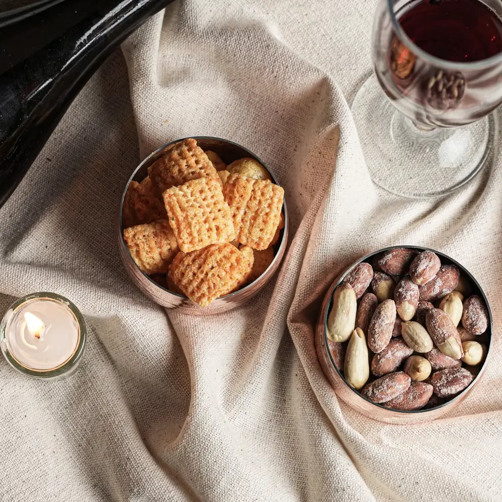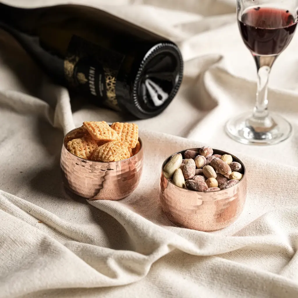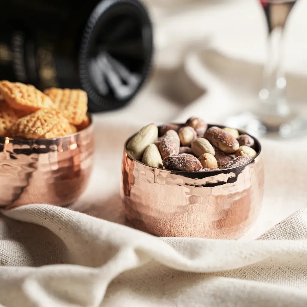Add an artisanal touch to your table with these Handcrafted Hammered Copper Snack Bowls. Featuring a stunning hammered finish, they are perfect for serving nuts, candies, dips, or small appetizers. Made from 100% copper, these bowls combine elegance with practicality, while the tin-lined interior ensures they’re safe for use with all types of food. Whether hosting guests or enjoying a cozy evening at home, these versatile bowls bring a sophisticated charm to any occasion. Each piece is individually crafted, highlighting its unique character and timeless beauty.