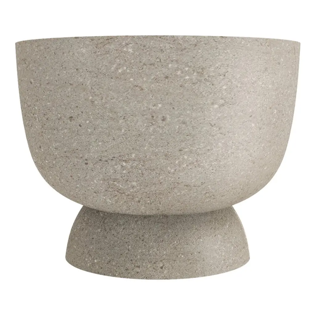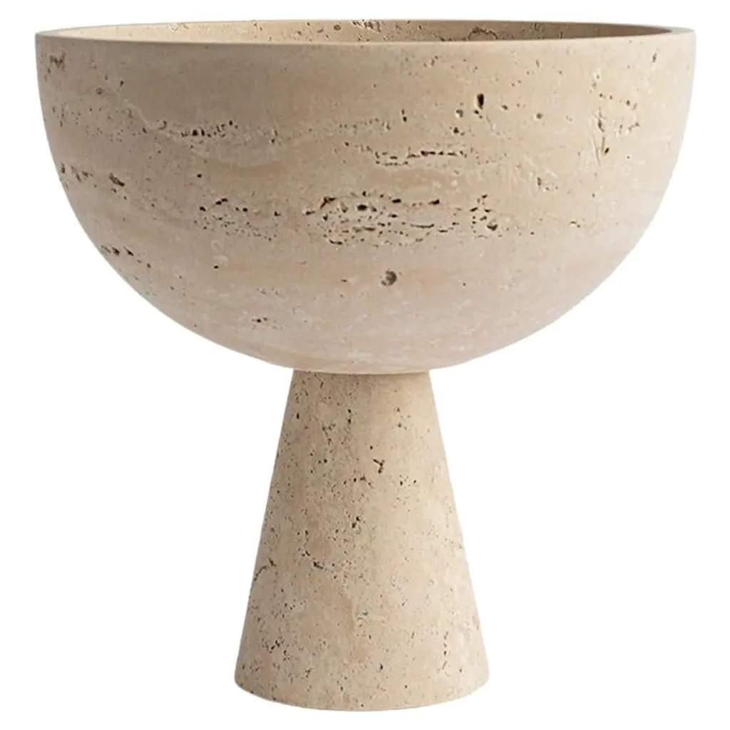 A substantial silver travertine bowl with unique structure rests atop a pedestal for a grand presentation of fruits and vegetables. Due to the nature of the material, each piece may vary slightly in appearance. We encourage embracing the variations that make each piece unique. The minimal form of this bowl allows the material to be the main focus.Measures : Extra large 25 x 25 cmMatte finish.