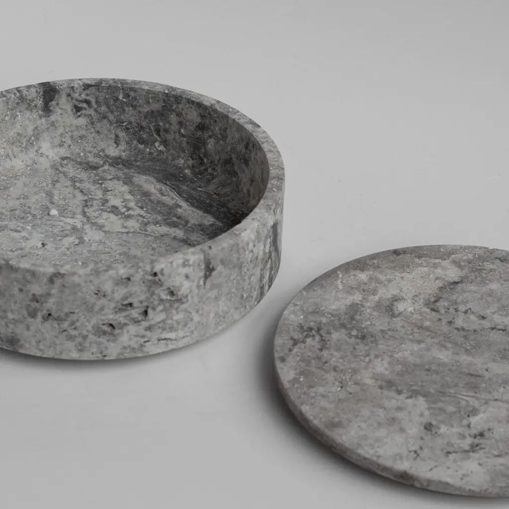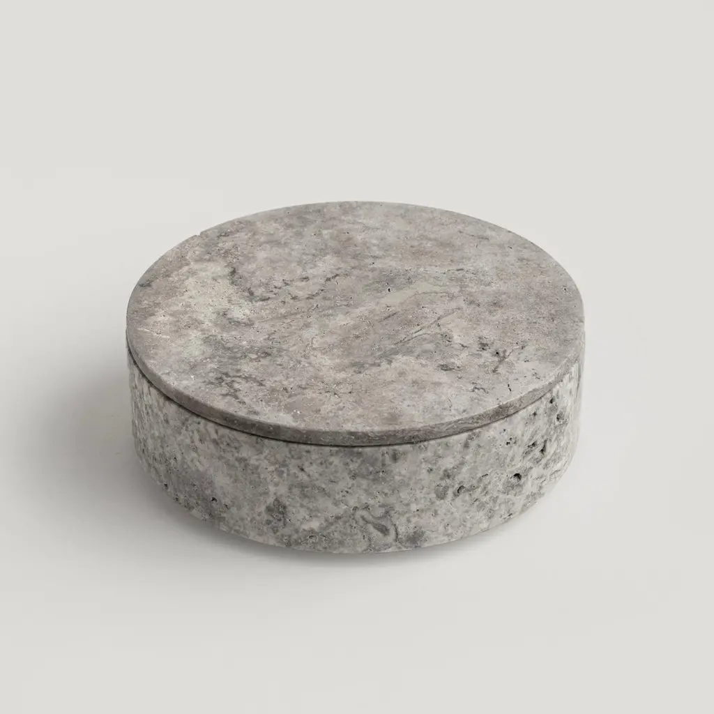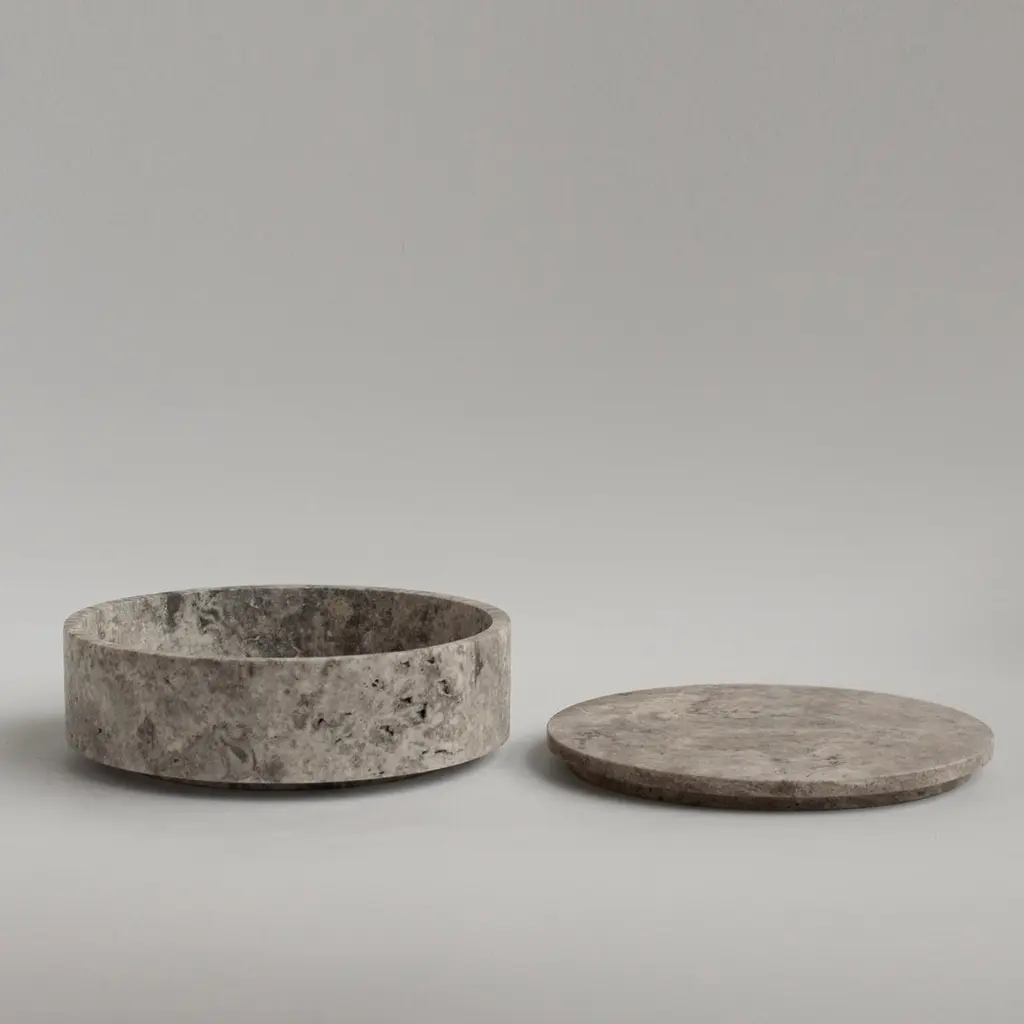 Stunning, aesthetic, timeless are words that can be used to describe this elegant and modern travertine bowl from Kiwano. Expertly crafted and finished by hand, our travertine vases are a study in sculptural simplicity. Natural variations in the stone's distinctive veining, tonal hues and organic texture reveal the inherent beauty and one-of-a-kind character of each piece. Overall dimensions: W: 25 cm D: 25 cm H: 8.5 cm (incl. lid)Material: Silver TravertineCare: do not use any acid, clean with a gentle cloth and soap
