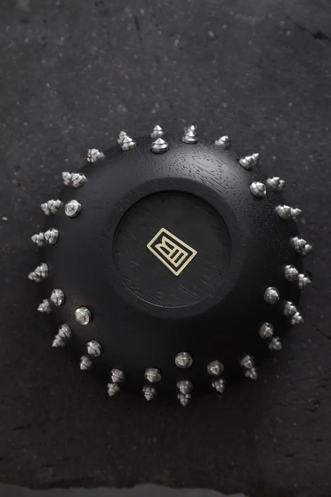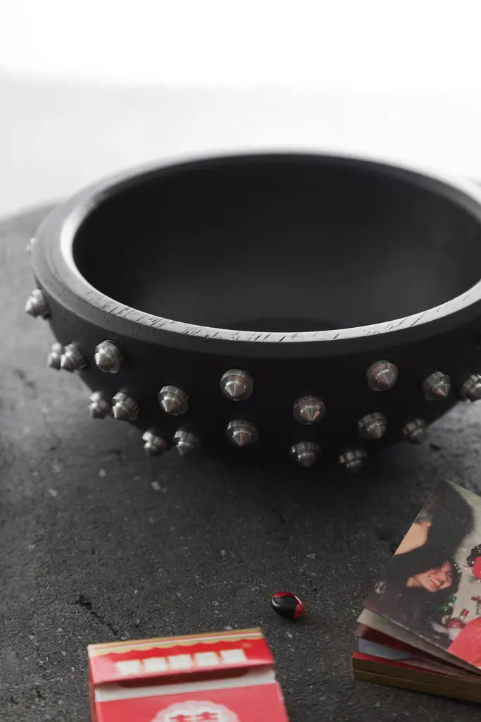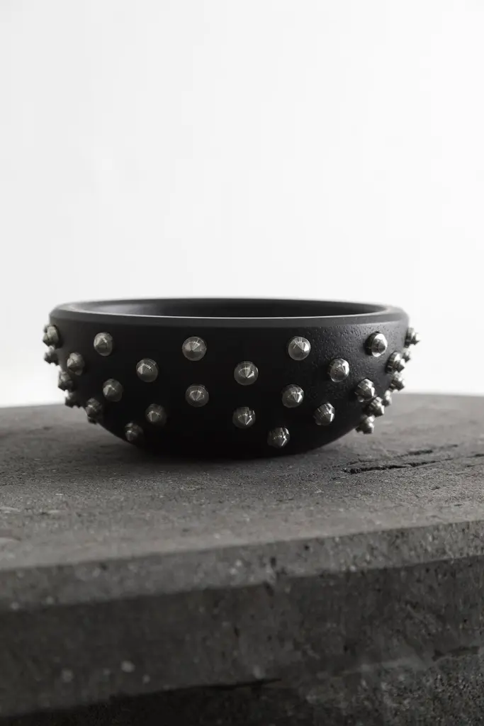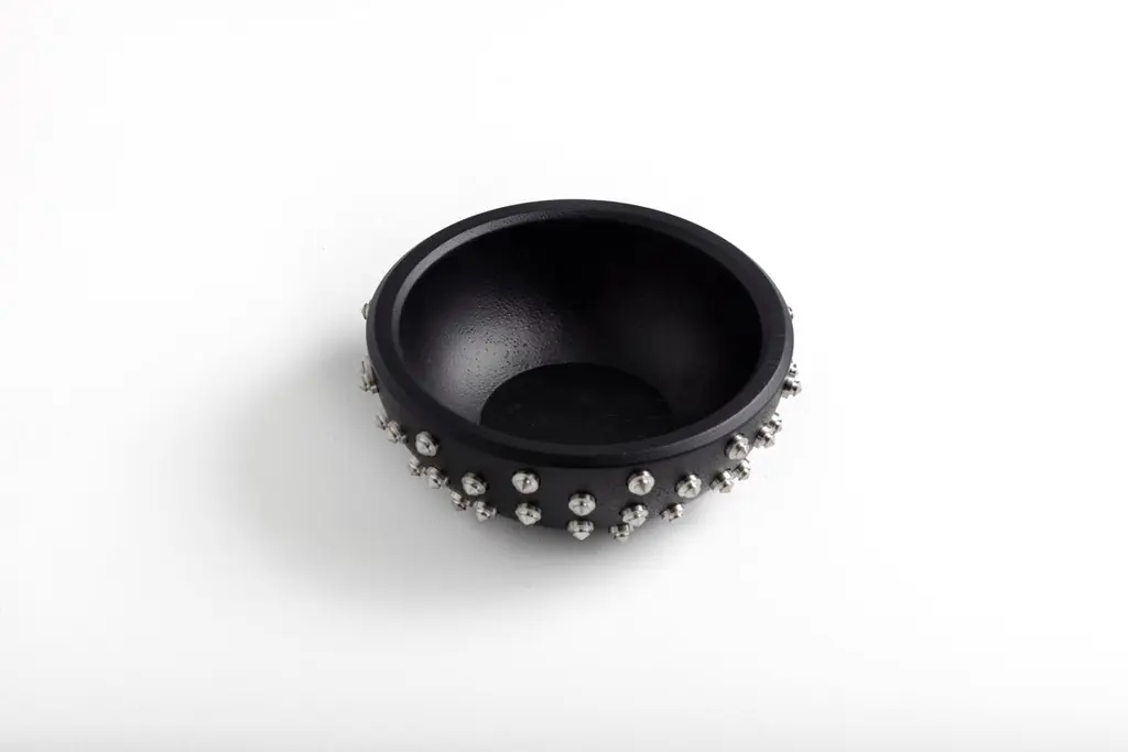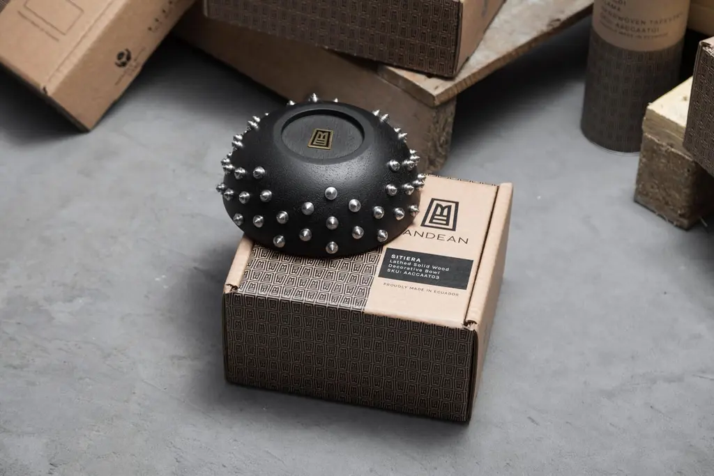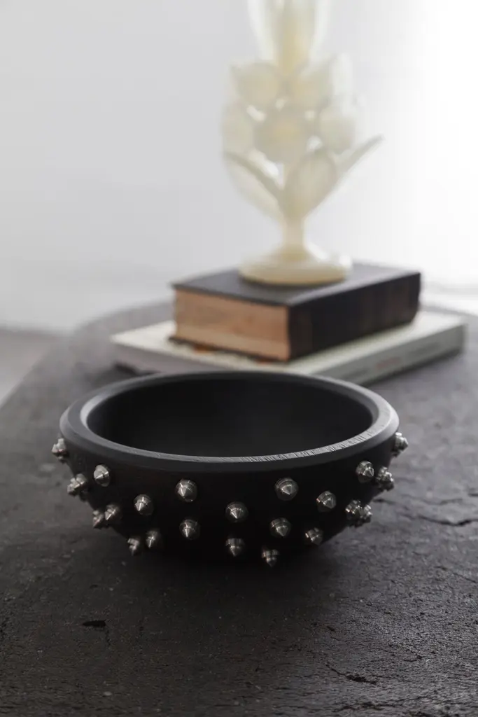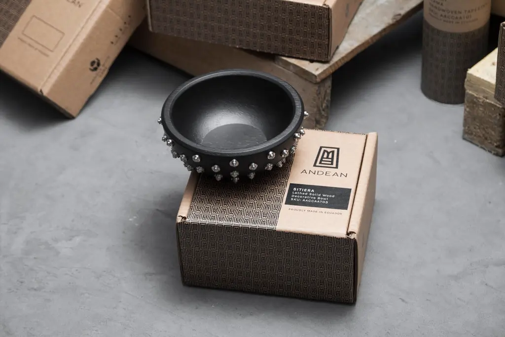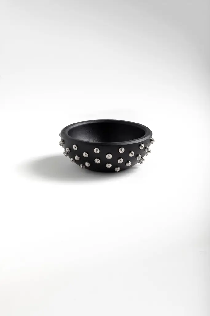 Decorative lathed solid seike wood bowl, with aged bronze or stainless steel details.Drawing inspiration from the sacral and baroque motifs of Quito, as well as Ecuador’s highest and dormant volcano, these bowls are meticulously hand-carved from volcanic stone sourced from Chimborazo's quarries and elegantly paired with CNC-lathed solid seike wood and bronze accents.SOULFUL OBJECTS represent a journey through our heritage and traditions. A family of objects that depict the autochthonous materials and artisan methods of Ecuador. The collection comprises an array of decorative and functional objects— bowls, candleholders, decorative pillows, and tapestries— showcasing materials such as hand-carved volcanic stone from the quarries of Chimborazo, Ecuador's highest and dormant volcano, opulent bronze, stainless steel, and sumptuous velvet.The designs collectively tell our story of Latin America. Every object is the result of a thoughtful approach to Ecuadorian material culture and iconography. Selecting the ideal artisan technique to produce a sophisticated, modern abstraction. An ideal platform for our artisans to embed their generational knowledge. Leaving their soul's signature on every seam, every crease, every chisel mark.ANDEAN studio’s practice is an exploration that highlights Ecuador's iconography and our Latin American essence. New items will be added to our ongoing collections every year, each bearing our equatorial design stamp and a distinct aesthetic.ARTISANS:Washington Romero: WoodworkingEdison Simbaña: Bronze and Stainless Steel CNC Lathe