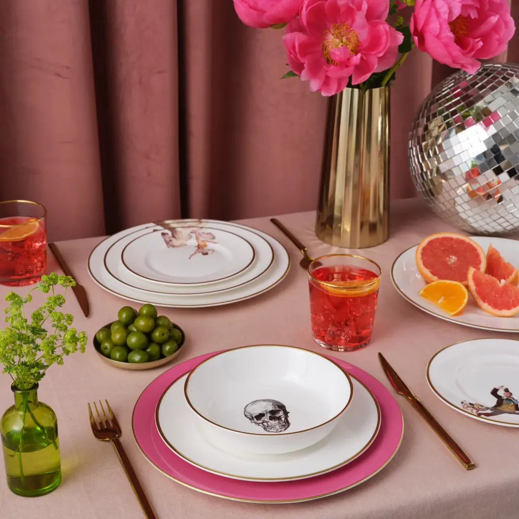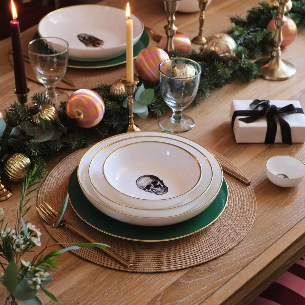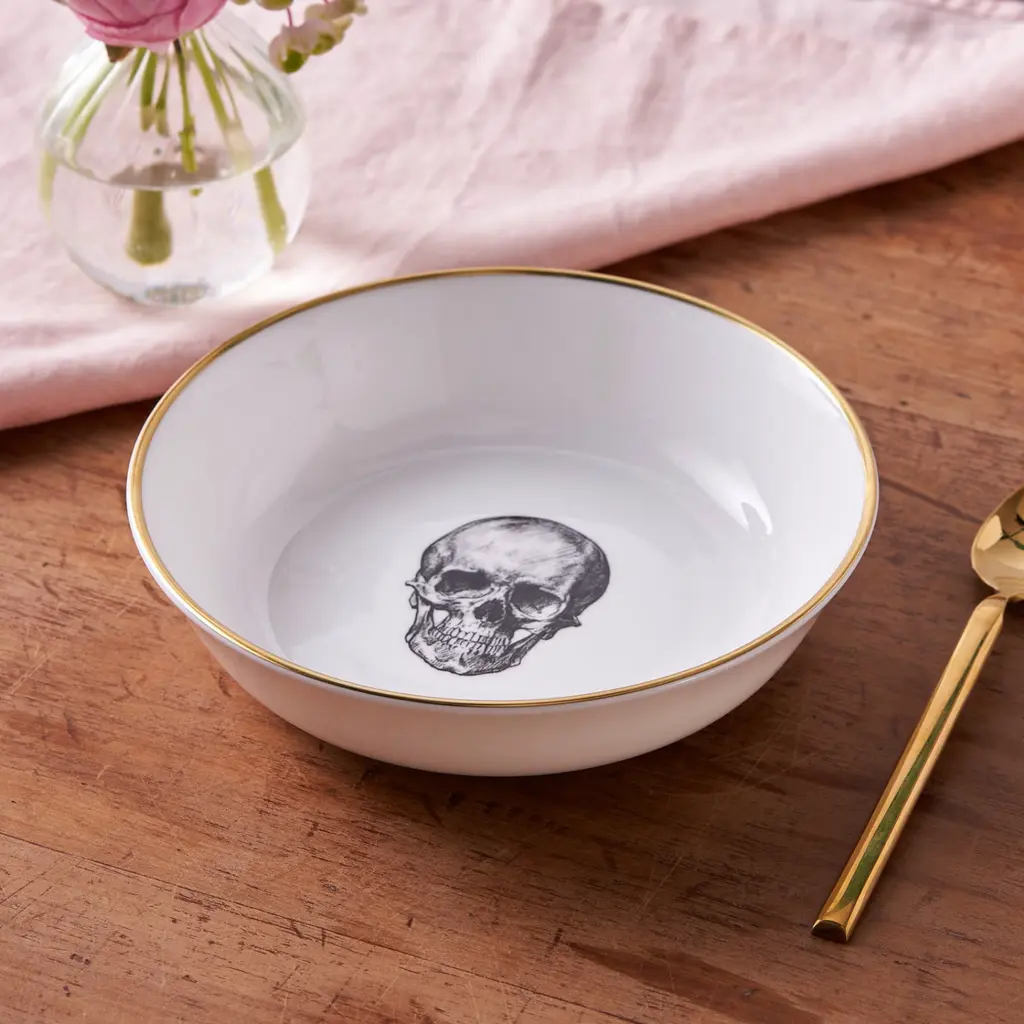 An exquisitely handcrafted fine bone china dessert bowl with the Skull design from the Melody Rose Rock and Roll collection. With it's elegant and modern shape, the small sized bowl measures 17cm and is perfect size to use for desserts, fruits and yogurt but can be used for any meal from breakfast cereal to soups or serving snacks. Handmade in Stoke-on-Trent, England's pottery heartland, each bowl is edged with hand painted 22kt burnished gold for a luxurious and dishwasher friendly finish.The playful design paired with the best of British craftsmanship makes this bowl the perfect gift for foodies, design lovers and everyone in between.Beautiful on it's own or mix, match and layer from the Melody Rose collection to create a unique, heritage tableware set with a 21st century twist.