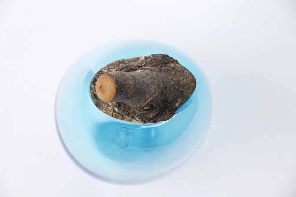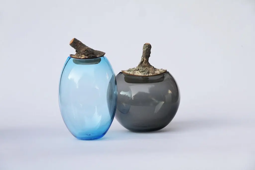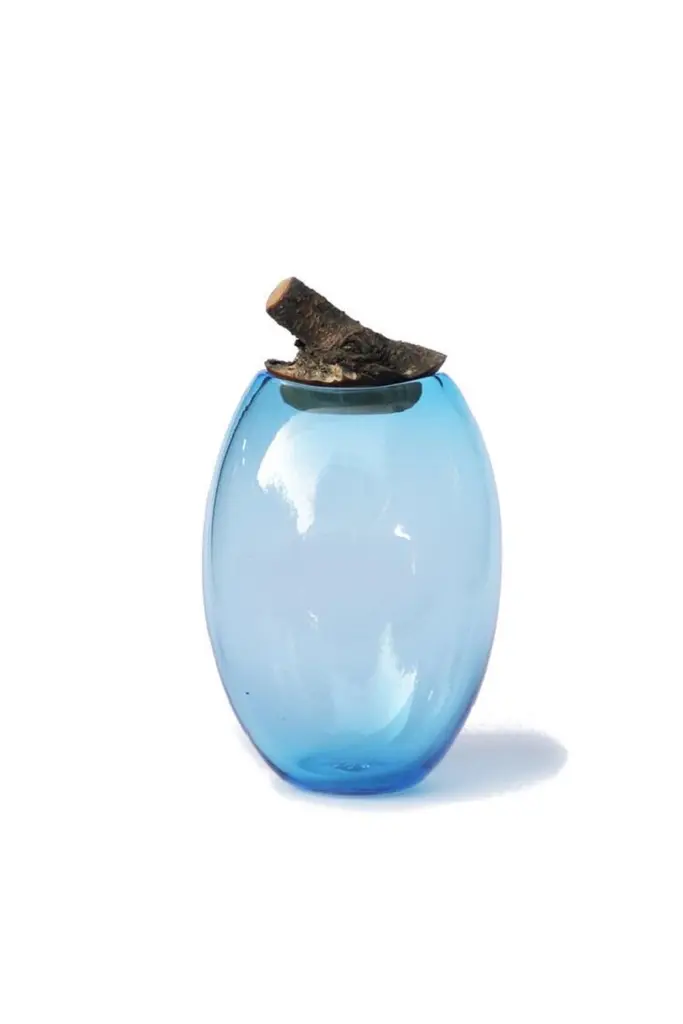 Sky Blue Branch Bowl II, Pia Wüstenberg.Dimensions: D 16-18 x H 29.Materials: glass, wood.Available in other colors.A playful jar, with a lid made from a branch stub following the curvature of the glass. Branch Bowls are blown without a mould: their outer rim is originally the inside of the glass bubble, thus their round and soft edges, characteristic of this artistic process.Handmade in Europe: freehand blown glass (England), wood (Finland).The materials then come to our warehouse in North Germany where they are fitted and assembled.Pia Wüstenberg, UtopiaPia Wüstenberg is a creative with a passion for materials and craft. She graduated from the Royal College of Arts Design Products course in 2011 and was running her own freelance studio in East London till summer 2017. After this her studio relocated to rural North Germany, allowing better access to the European crafts and more time to dream. Pia is a freelance designer at Utopia and utility and owner of the brand (which involves everything from heavy lifting to drawing up new ideas).