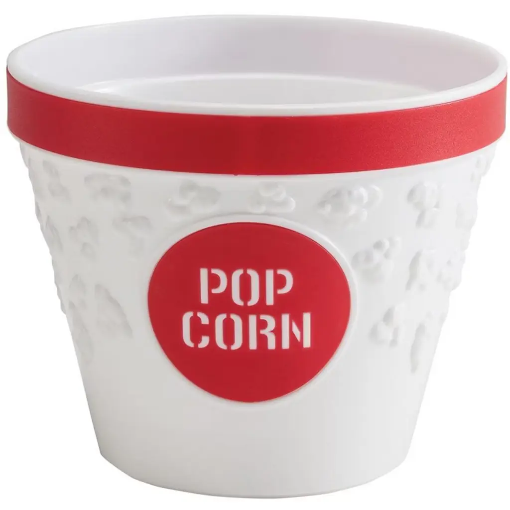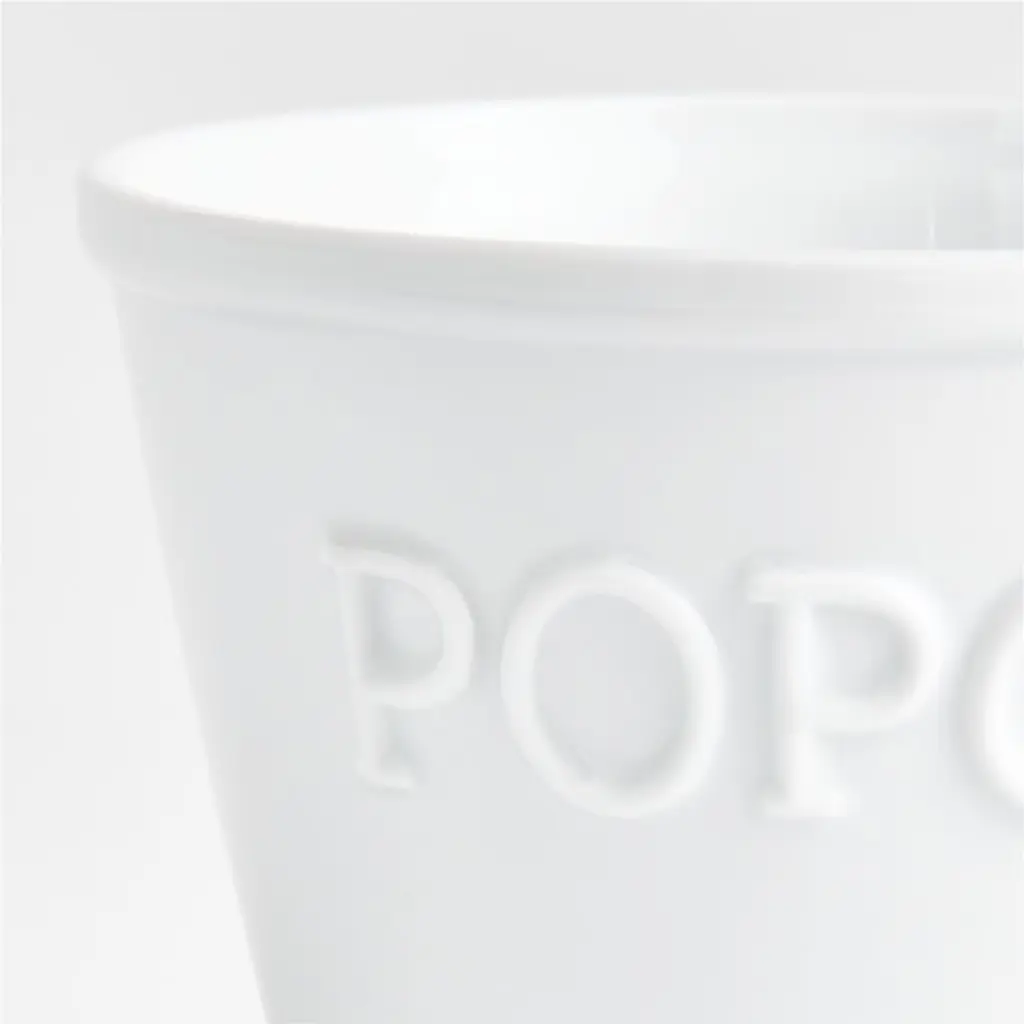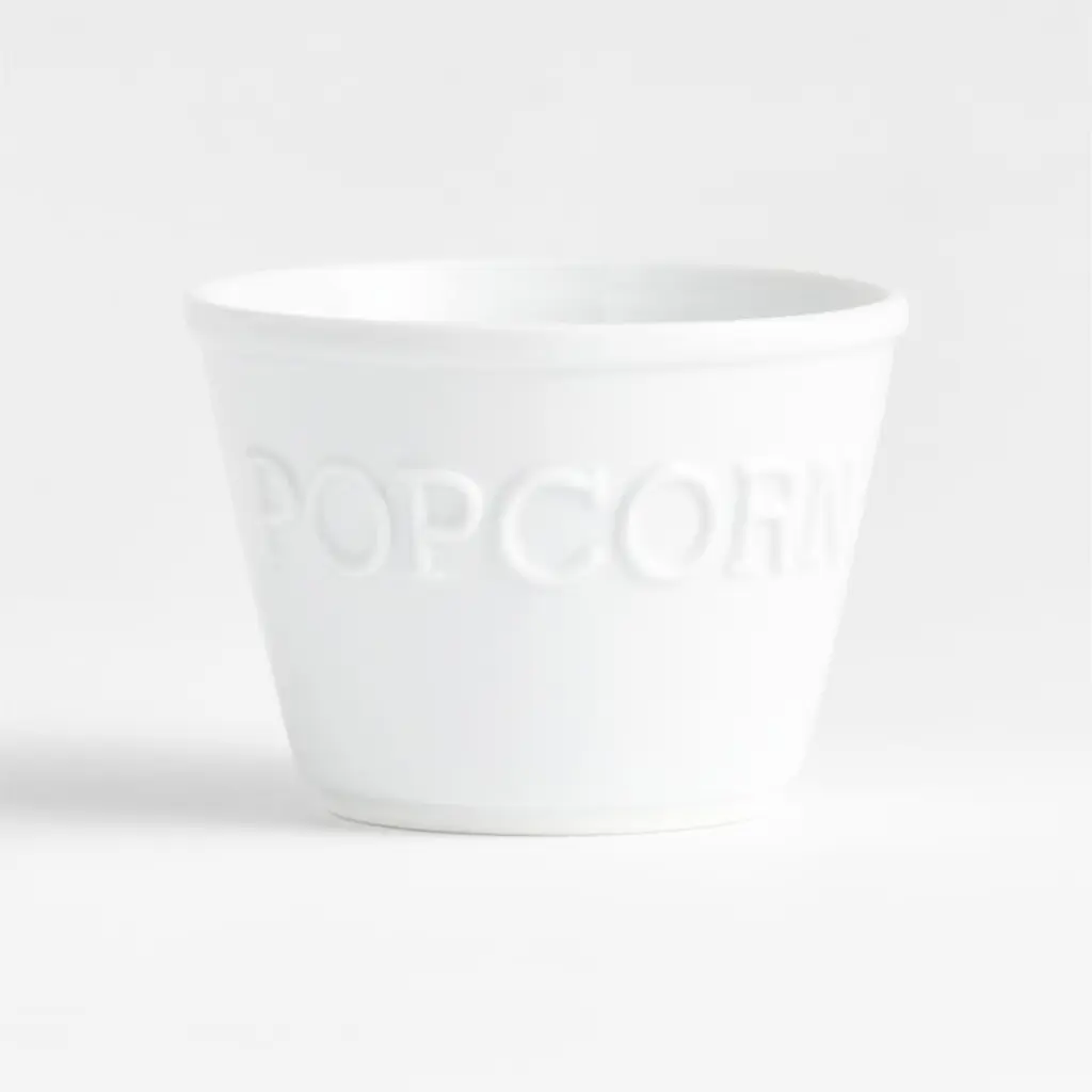 Molded with the word "popcorn," this white earthenware popcorn bowl is the perfect addition to your next movie night. Made of high-fired glazed earthenware, this bowl has a fun embossing with popcorn spelled out. Matching large popcorn bowl is also available.