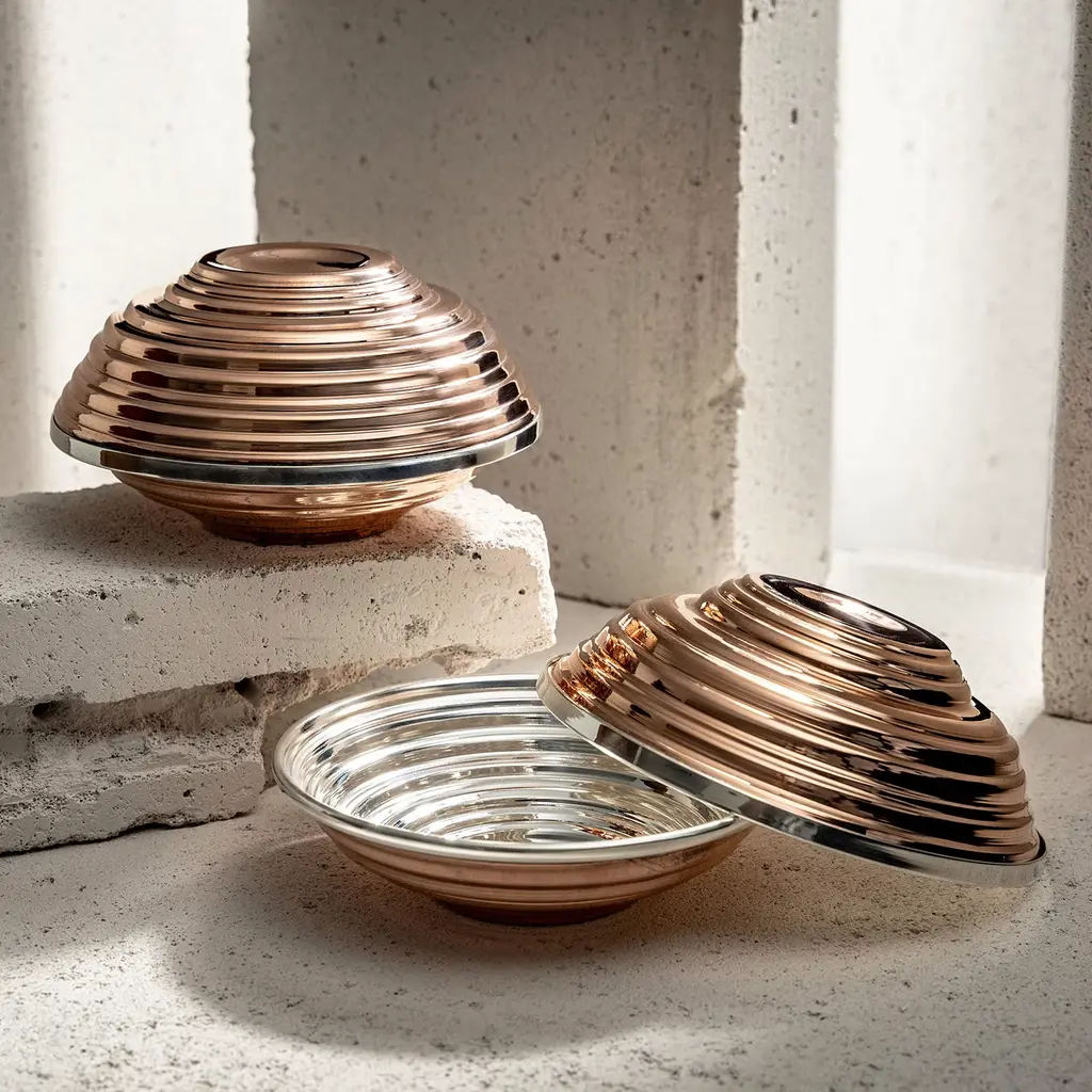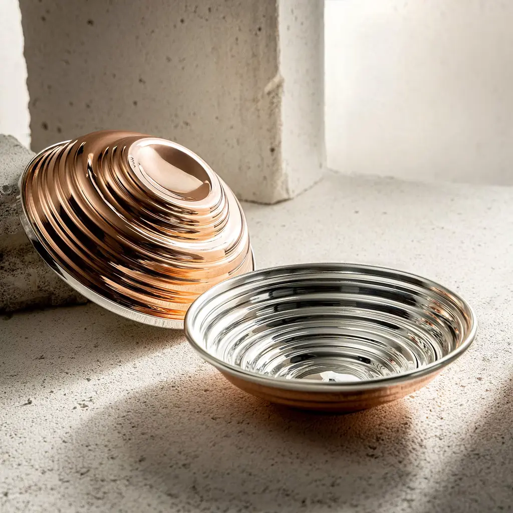 Elevate your home dining experience with our Serrated Rainbow Patina Copper Bowl Set, a beautiful combination of functionality and artistry. This exclusive set includes two 500 ml bowls - a base and a lid - each crafted from solid copper and finished with a mesmerizing rainbow patina. Designed and handcrafted by skilled artisans, these bowls offer both beauty and versatility, serving as perfect vessels for your culinary creations or as stunning decorative pieces that add a splash of color to any room. The unique patina finish ensures that no two sets are exactly alike, offering a truly unique addition to your kitchenware collection.