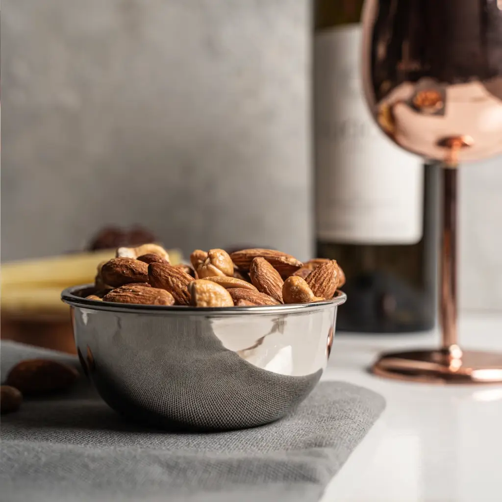 Simple yet striking, this chrome-plated copper bowl is designed to complement any table setting or kitchen decor. Its clean, reflective surface adds a touch of modern elegance, making it perfect for serving nuts, fruits, or small snacks. With its smooth, rounded form and versatile style, this bowl transitions effortlessly from casual meals to sophisticated gatherings.