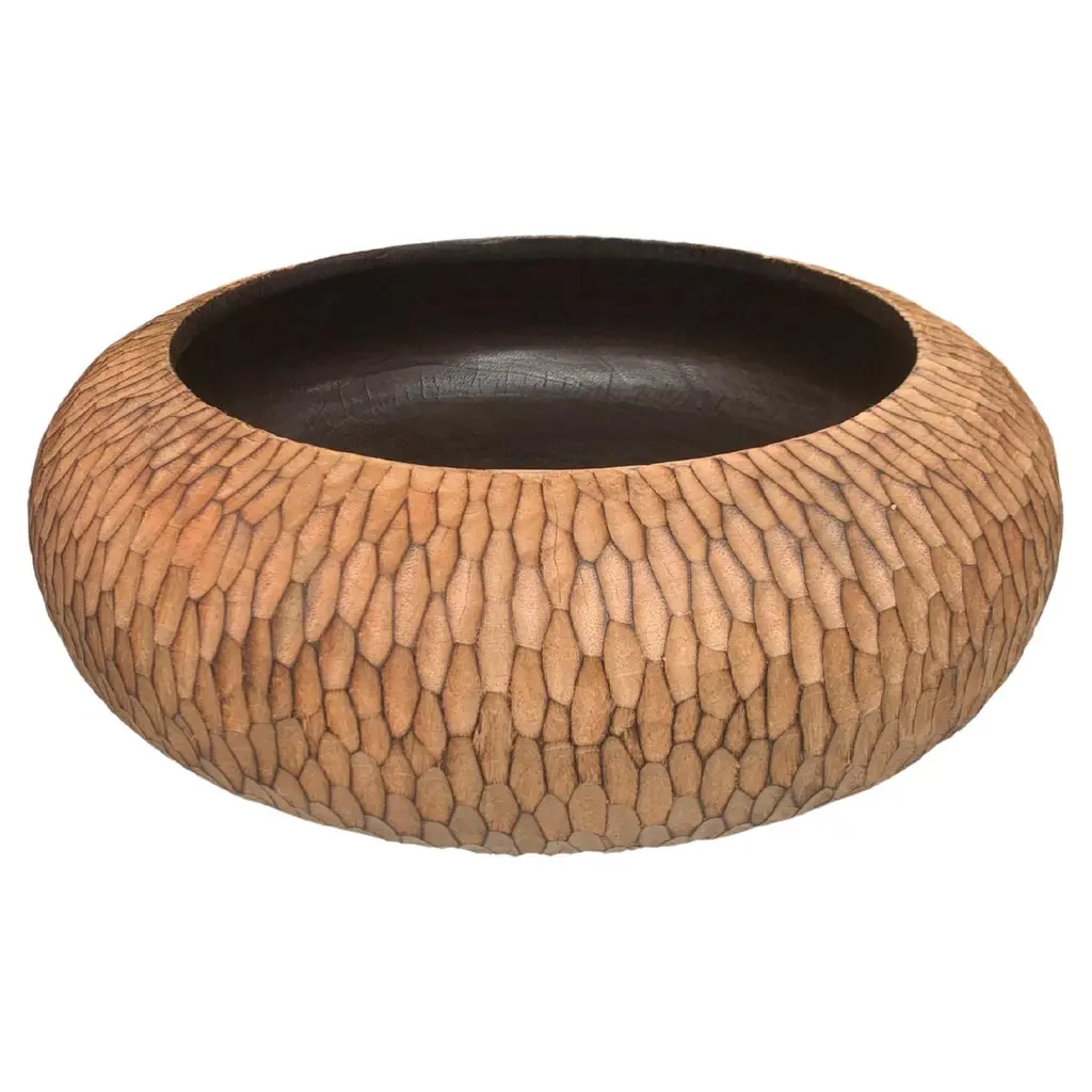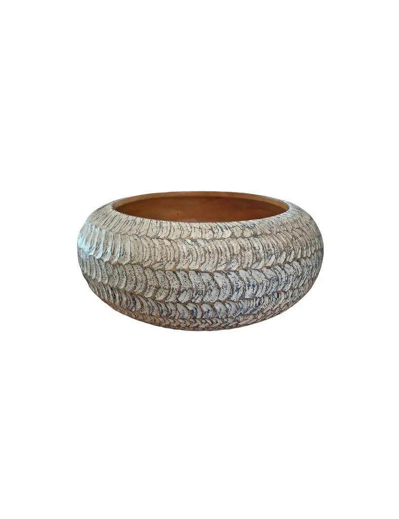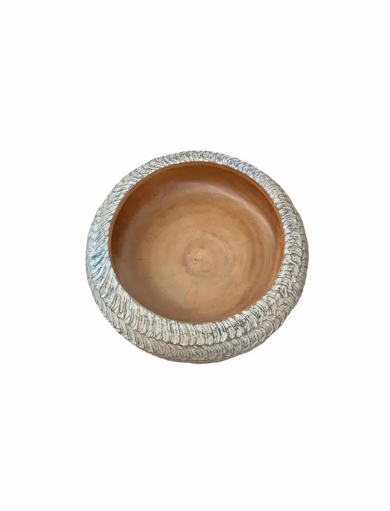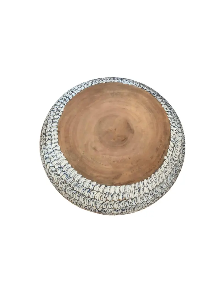 A hand-crafted mango wood bowl. The bowl was cut from a much larger slab of mango wood and features a hand hewn texture on its sides. It features a wonderful mixture of blue &white pigment that is then sanded down to achieve a unique texture. The bowl is then completed with a clear coat. It maintains a wonderful wood texture and shades.