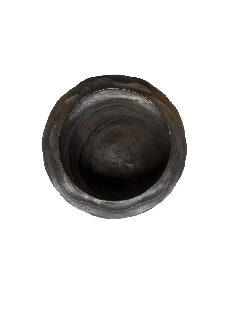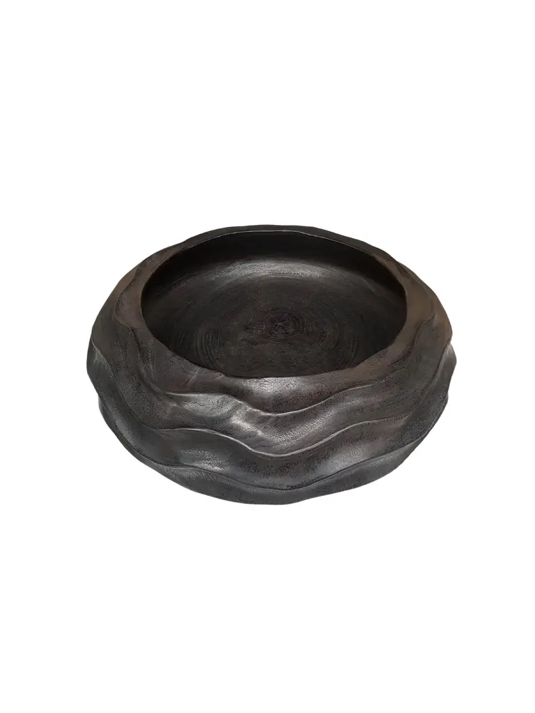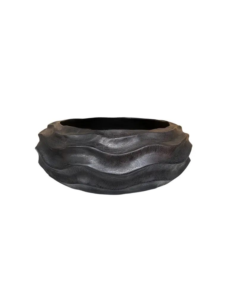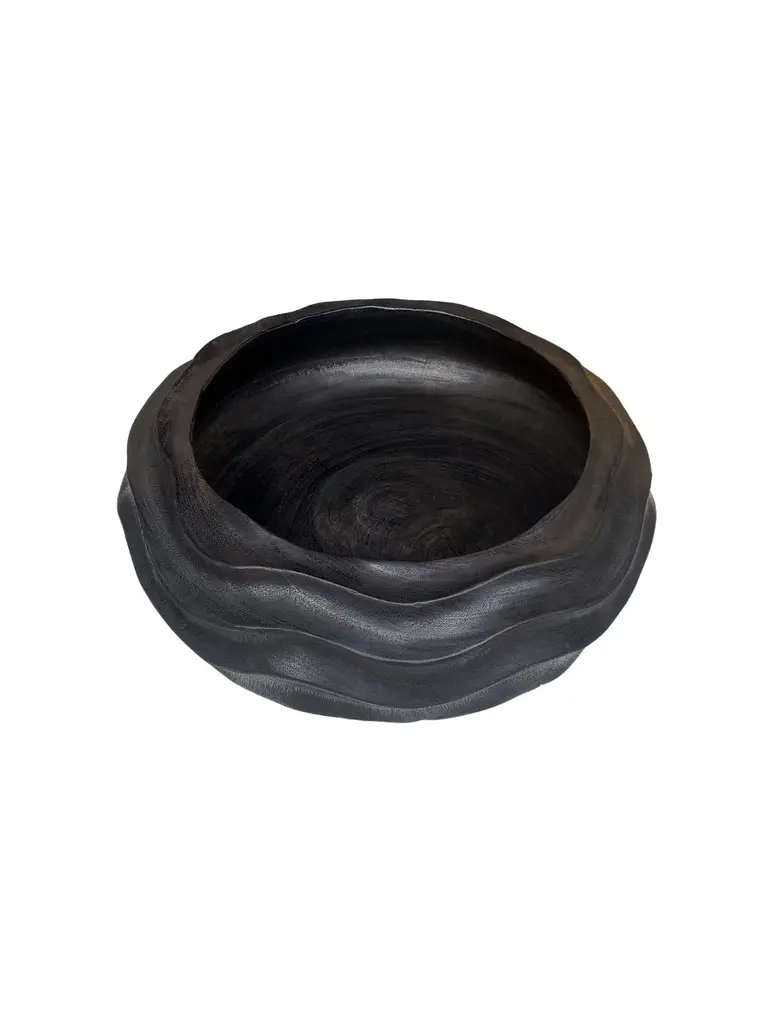 A hand-crafted mango wood bowl. The bowl was cut from a much larger slab of mango wood and features a curved and ribbed texture on its sides. To achieve its rich black colour the bowl was burnt three times and finished with a clear coat. A wonderfully sculptural object.