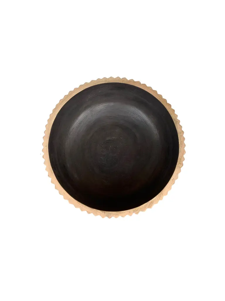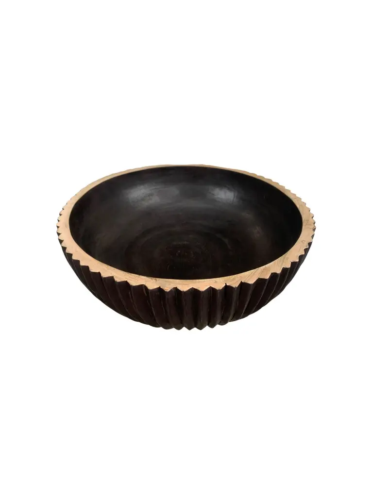 A hand-crafted mango wood bowl. The bowl was cut from a much larger slab of mango wood and features a ribbed texture on its sides. To achieve the rich black colour the bowl was burnt three times and finished with a clear coat. The rim was then sanded down to expose a wonderful natural wood texture and contrast. This bowl is a wonderfully sculptural object.
