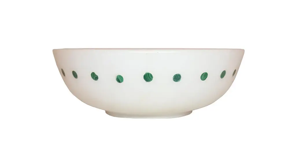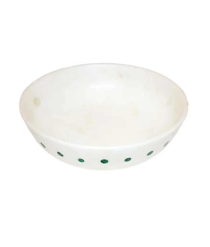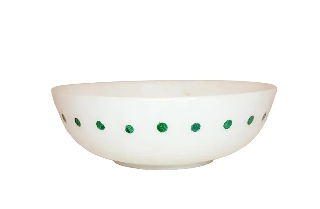 Spotted Bowl in White Marble inlayed with Malachite.Spotted BowlSize- 9.5” x 9.5” x 3.5” H.Materials - White Marble, Malachite, Hand-CarvedBuyer Cancellation-The cancellation charge is 25% which increases to 50% if the production is started.Prices do not include shipping from India (for custom orders) or our MN warehouse (items from stock). That will be additional.