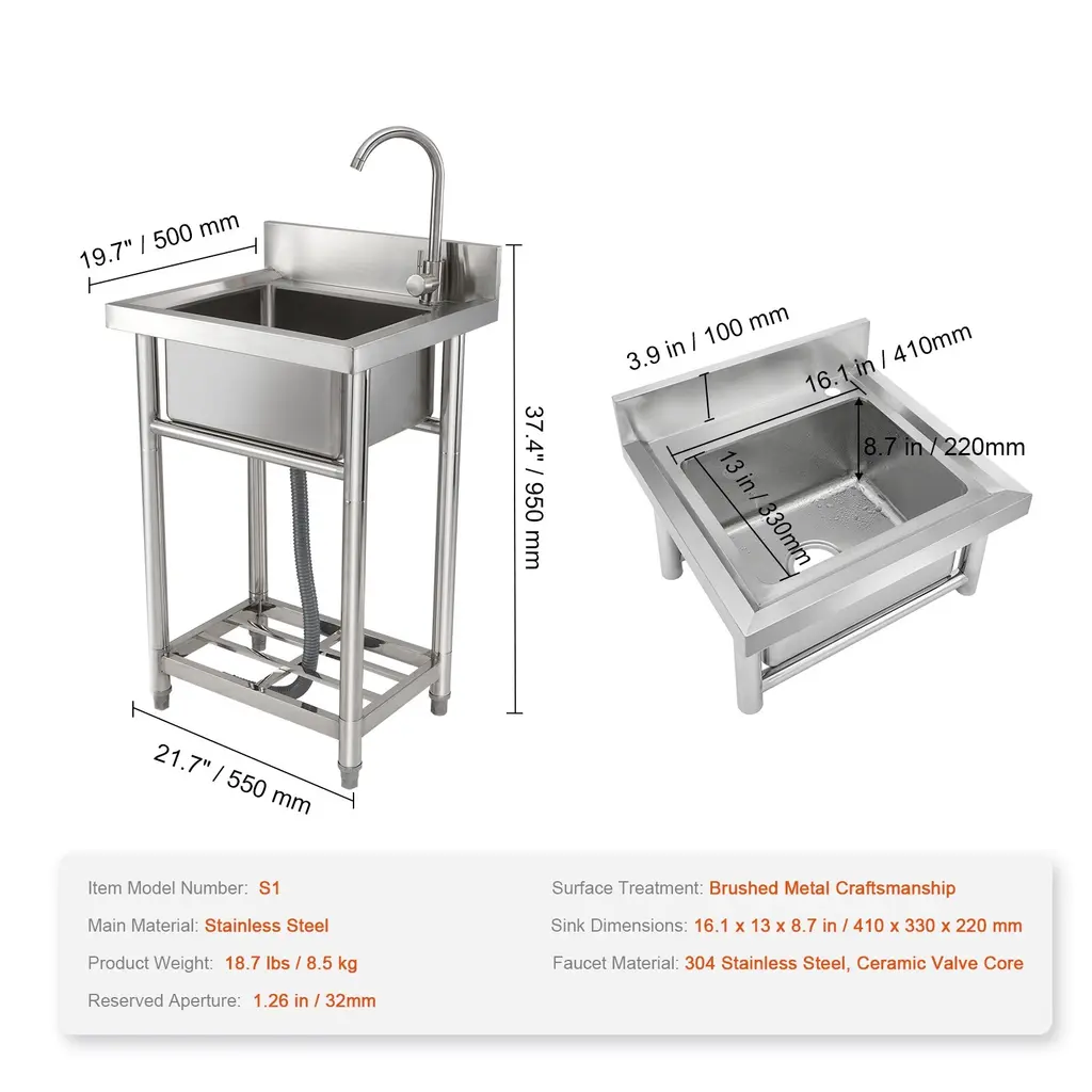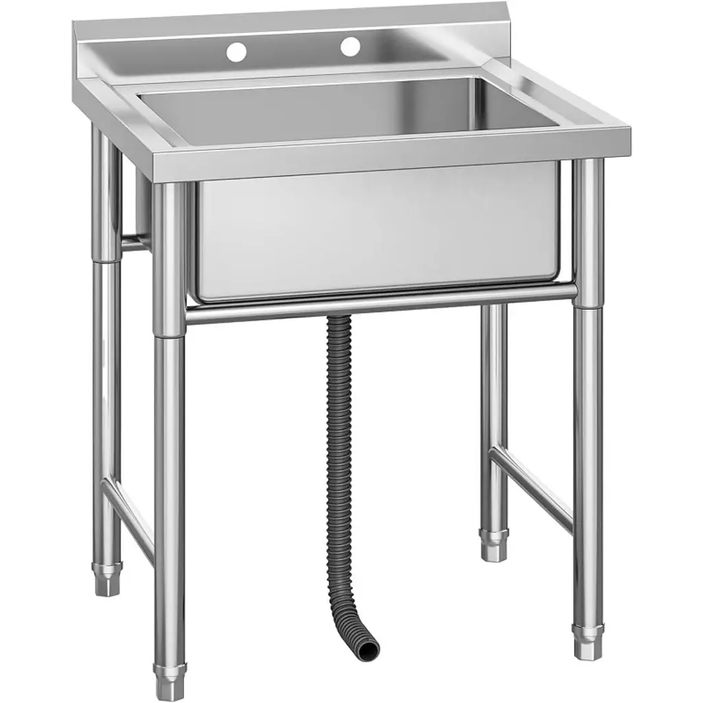 Stainless Steel Sink: This sink is made of high-quality stainless steel, ensuring excellent corrosion resistance, oxidation resistance, and wear resistance. Its all-metal construction guarantees a longer lifespan in most environments. The adjustable table legs provide stability even on uneven surfaces. Clog-Free Design: The multi-layer sealed drain comes with a removable filter basket to prevent food and debris from clogging the pipes. The thickened PP drain pipe ensures faster drainage and maintains flexibility without deformation. Hot & Cold Faucet Included: The 304 stainless steel hot and cold faucet allows 360° rotation for water direction, providing unrestricted water usage. It features a ceramic valve core that is explosion-proof and enables precise control of hot and cold water. The faucet is safe, reliable, and leak-proof, ensuring a longer lifespan. (Inlet hoses for the faucet need to be purchased separately.) Versatile Functionality: This sink workstation offers ample space for washing and handling food. It also includes a knife storage area in a child-safe location and an open storage space at the bottom for cleaning tools and accessories. The hollowed-out design effectively prevents water from pooling, making it easy to clean and maintain. Wide Range Of Applications: This sink kit is not only suitable for cleaning food and utensils but also serves as a pet wash station. It is widely used in kitchens, bars, restaurants, dessert shops, self-service restaurants, garages, or any other commercial establishments. If used for residential purposes, it is a highly useful equipment for backyards or gardens. (Please wear protective gloves during installation to avoid injury. Package Content 1 x Workbench with Sink 1 x Kitchen Faucet 1 x Drain Hose Set 1 x User Manual