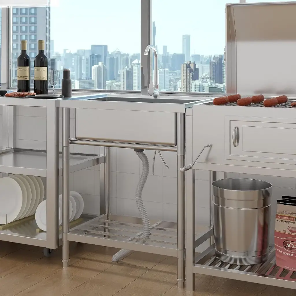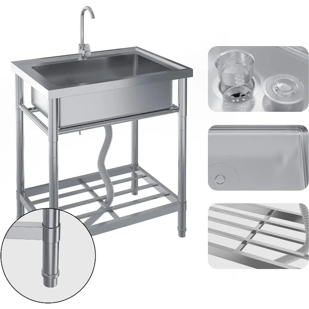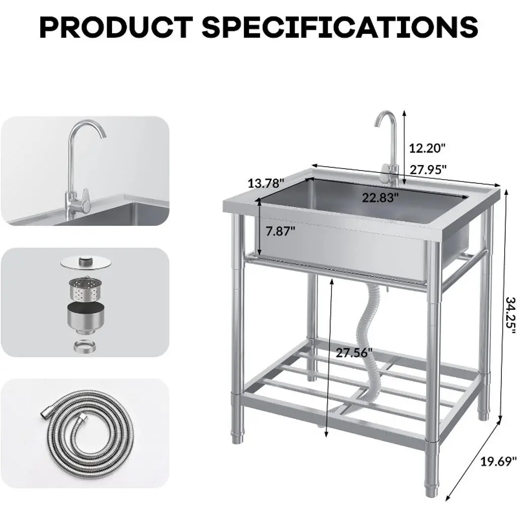 Tired of makeshift cleaning stations that don't hold up? This professional-grade stainless steel utility sink brings commercial durability to your home or workspace. Picture washing paint brushes in the garage without worrying about stains, or finally having a proper spot to clean garden vegetables outdoors. The 304 stainless steel construction stands up to years of heavy use - no rust, no stains, just wipe it down and it looks new again. What makes this sink different? First, it actually fits where you need it. The compact design tucks neatly into laundry rooms, workshops, or outdoor areas, while the included storage rack keeps supplies organized. Those adjustable legs mean you can set it up perfectly level, whether your floor is concrete, tile, or uneven pavement. The real game-changer is the professional plumbing setup. The 361° swivel faucet moves where you need it - fill buckets easily or wash large items without awkward angles. Hot and cold water hookups mean comfortable handwashing in winter and better grease-cutting power when cleaning. Plus, the high-flow drain handles everything from muddy boots to paint water without clogging. Assembly is straightforward - just connect your existing water lines, adjust the legs to level, and you're ready to work. No special tools or plumbing skills needed. From messy hobbies to outdoor cleanup to extra laundry space, this sink adapts to your needs. After years of struggling with inadequate sinks, isn't it time you had one designed to actually make cleaning easier? This isn't just another sink - it's the durable, functional solution you'll wonder how you lived without.