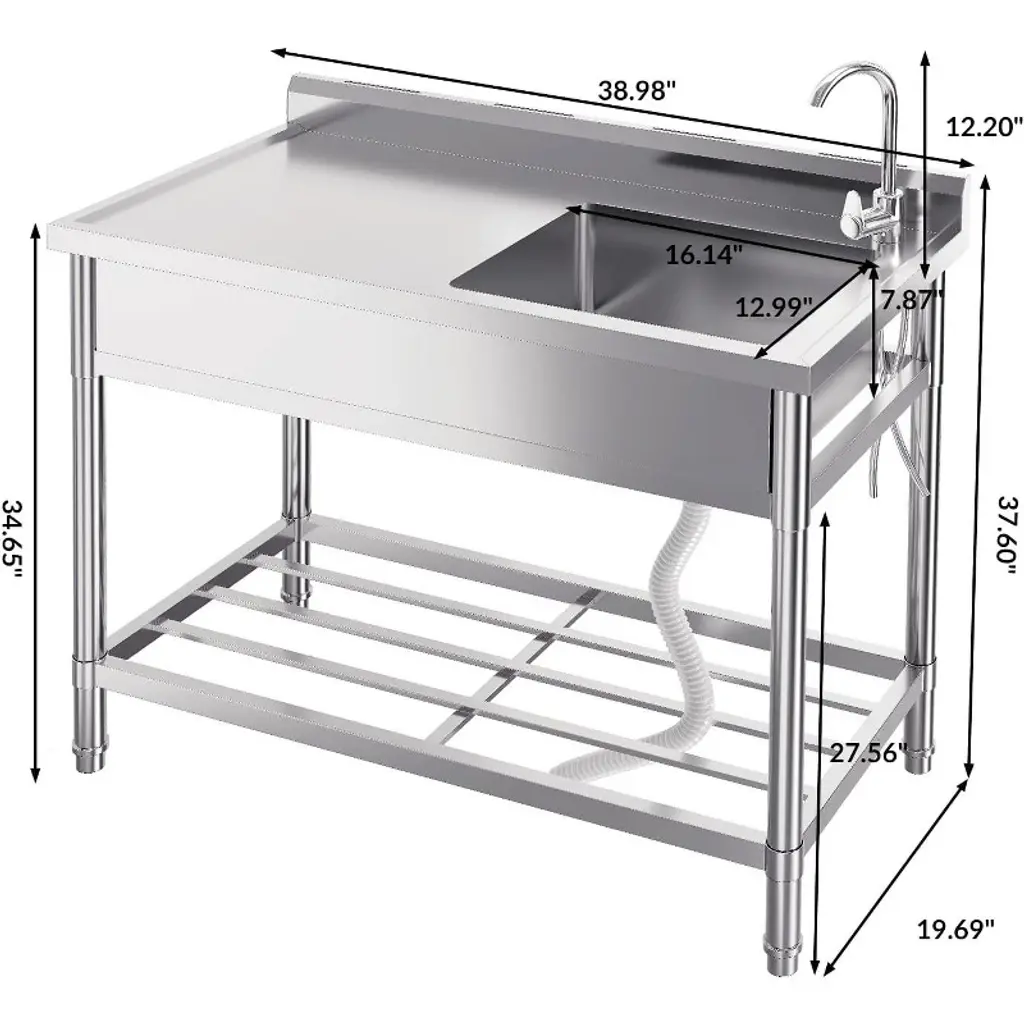 Tired of makeshift cleaning stations that don't hold up? This professional-grade stainless steel utility sink brings commercial durability to your home or workspace. Picture washing paint brushes in the garage without worrying about stains, or finally having a proper spot to clean garden vegetables outdoors. The 304 stainless steel construction stands up to years of heavy use - no rust, no stains, just wipe it down and it looks new again. What makes this sink different? First, it actually fits where you need it. The compact design tucks neatly into laundry rooms, workshops, or outdoor areas, while the included storage rack keeps supplies organized. Those adjustable legs mean you can set it up perfectly level, whether your floor is concrete, tile, or uneven pavement. The real game-changer is the professional plumbing setup. The 363° swivel faucet moves where you need it - fill buckets easily or wash large items without awkward angles. Hot and cold water hookups mean comfortable handwashing in winter and better grease-cutting power when cleaning. Plus, the high-flow drain handles everything from muddy boots to paint water without clogging. Assembly is straightforward - just connect your existing water lines, adjust the legs to level, and you're ready to work. No special tools or plumbing skills needed. From messy hobbies to outdoor cleanup to extra laundry space, this sink adapts to your needs. After years of struggling with inadequate sinks, isn't it time you had one designed to actually make cleaning easier? This isn't just another sink - it's the durable, functional solution you'll wonder how you lived without.