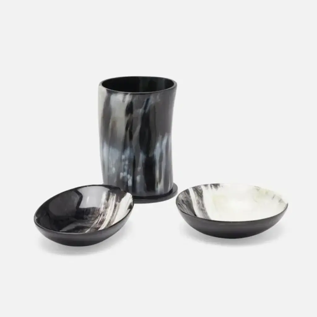 Indulge in a true gastronomic experience with the Sterlet Caviar Bowl (Set of 2) from Arcahorn. Made from handcrafted Venetian glass, this luxurious set features an elegant decoration in horn and wood with a glossy ivory lacquered finish. The larger bowl is perfect for filling with ice, while the refined cow horn teaspoon ensures the preservation of the caviar's delicate flavor. Highlights