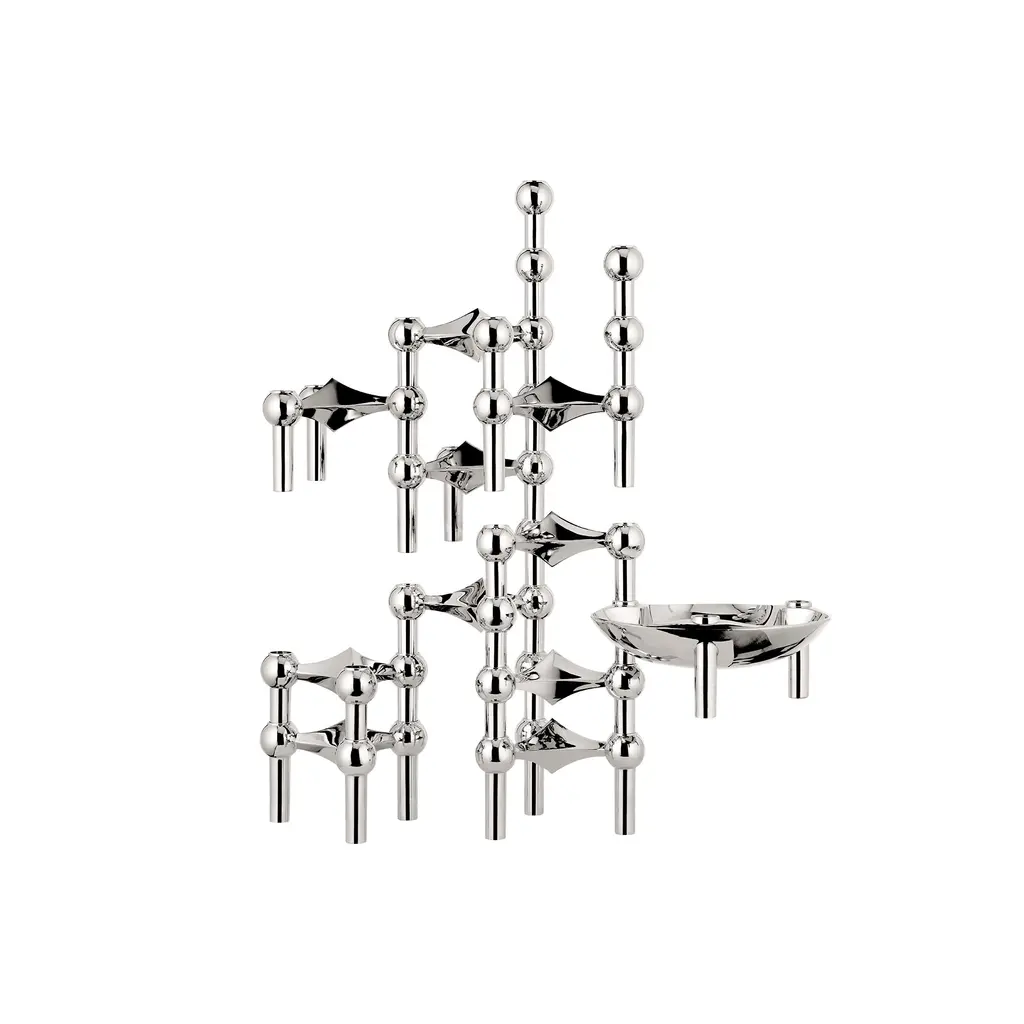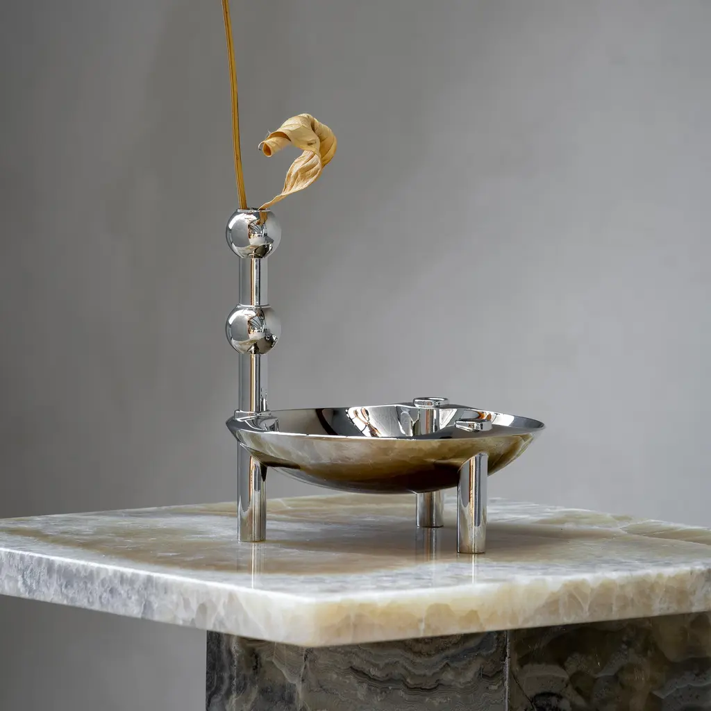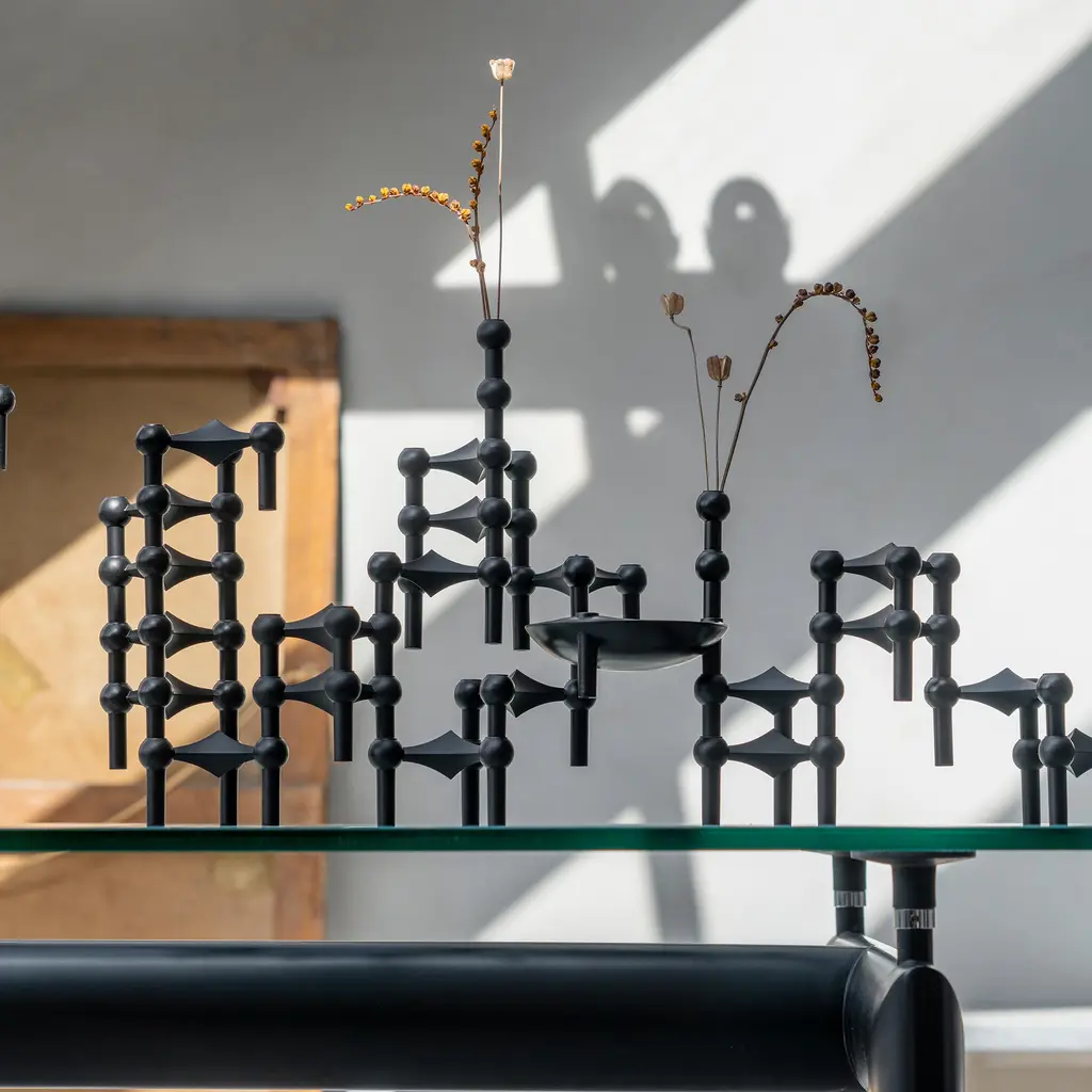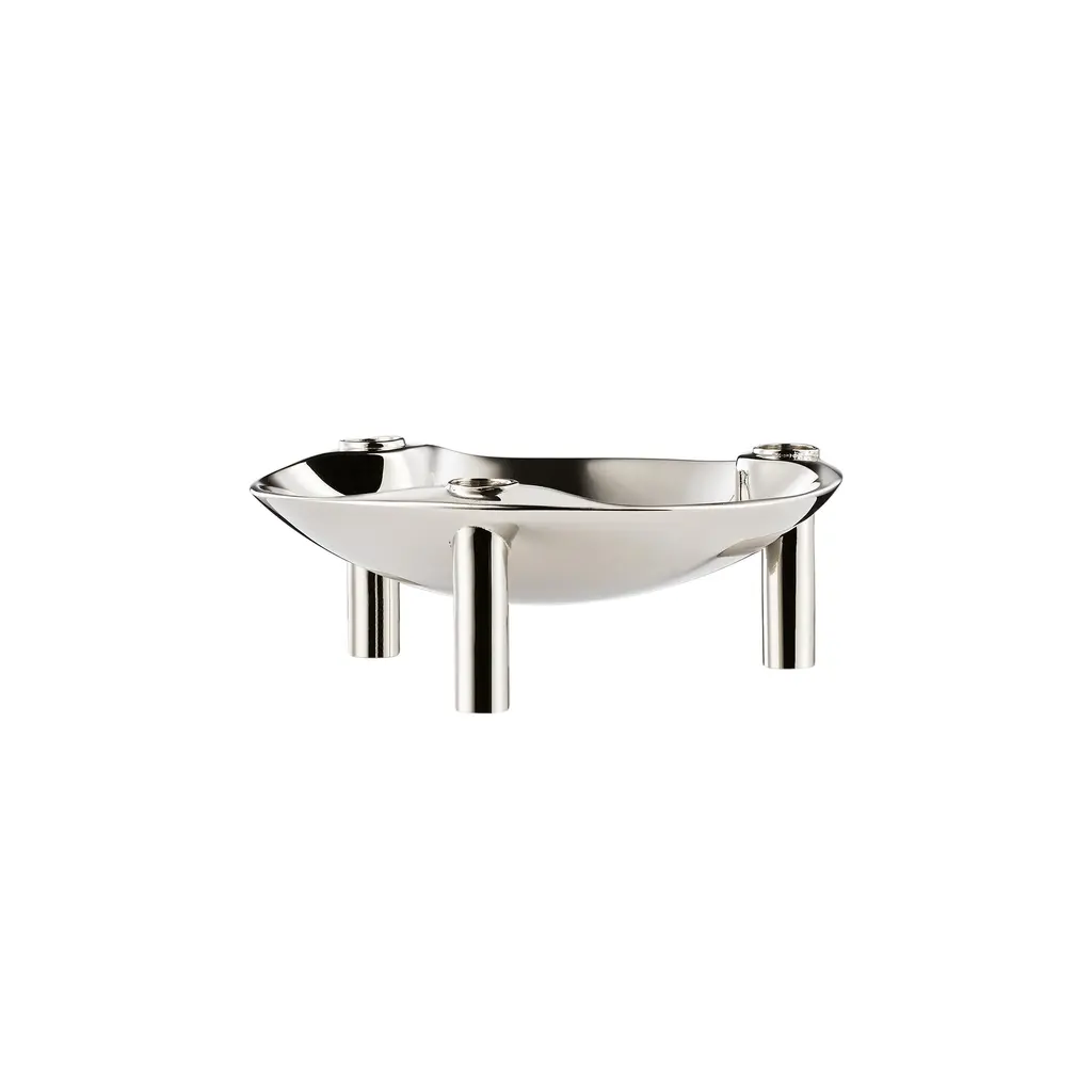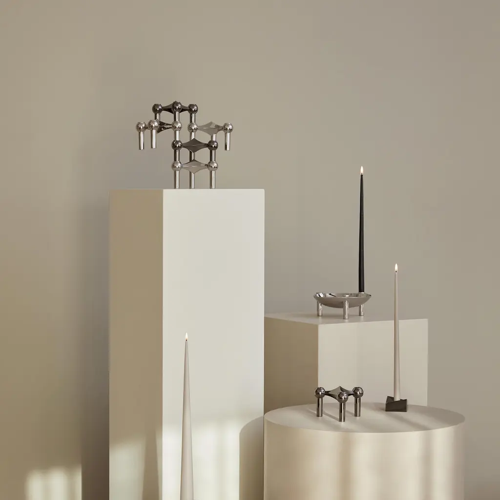 A bowl that’s also a module—part of the original STOFF Nagel system. First launched in the late 1960s, the STOFF Nagel bowl was initially conceived as an ashtray, but its form was quickly adopted for many other uses. Relaunched today, it works as both a standalone object and a connector within the wider Nagel collection. The bowl can be used on its own for keys, jewelry, or seasonal decorations. Add taper candles and it becomes a sculptural holder. Combine it with classic candle modules and the forms interlock, expanding into larger, customizable compositions. Each finish—mirror-bright chrome, warm brass that develops a natural patina, or matte black with a more contemporary edge—brings a different atmosphere while preserving the unmistakable Nagel silhouette. At 2.7″ H × 5.5″ D (6.9 × 14 cm), it’s compact enough for daily use yet designed to evolve into something larger when combined.
