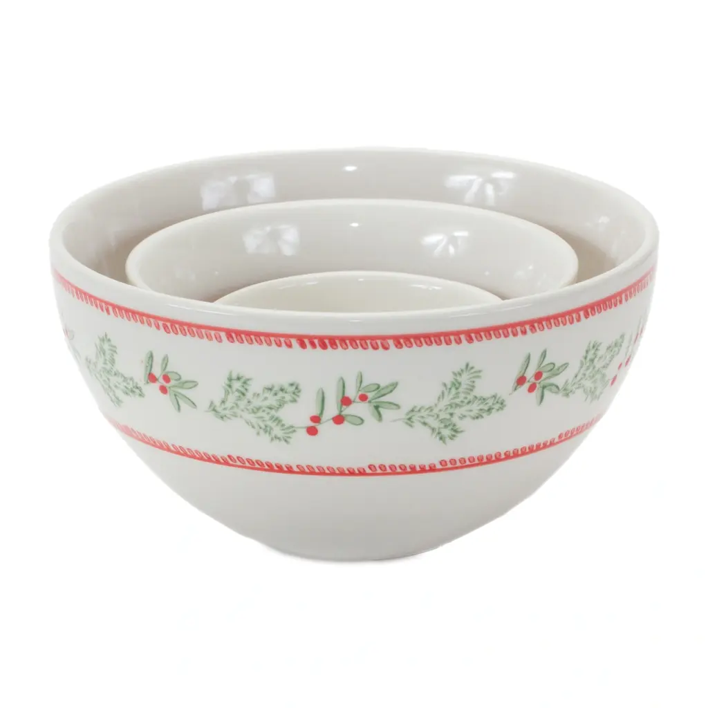 Description: Make your holiday decorating come alive with this set of three Mistletoe Bowls! Featuring a white finish with red accents, these stoneware bowls are adorned with a beautiful painted mistletoe & pine branch design. The traditional holiday decor will bring joy to any house and make your guests feel welcome. Add a touch of cheer to the holidays and get your set of Mistletoe Bowls today!Specification: