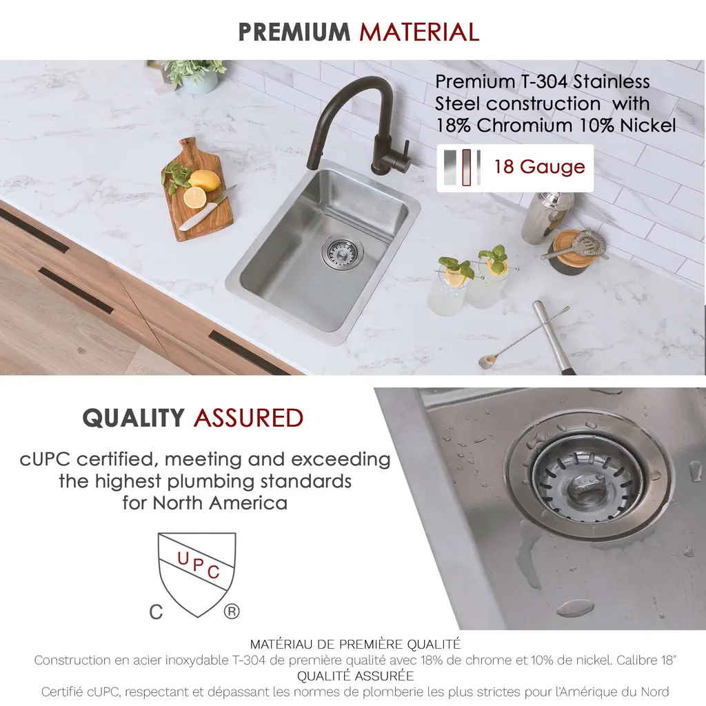 Introducing our premium T-304 Stainless Steel Sink, meticulously crafted to bring functionality to your kitchen. With an exceptional blend of style and durability, this sink is designed to elevate your culinary experience. Constructed using premium materials, our sink features a composition of 18% Chromium and 10% Nickel, making it highly resistant to corrosion and stains. The 18-gauge thickness ensures outstanding strength, providing long-lasting performance that withstands the test of time. With a modern aesthetic, the sink boasts a sleek design and 30 mm radius corners, adding a touch of elegance to any kitchen decor. This 12 1/2-inch sink provides ample space for all your washing and prep needs. It has a dual-mount design installation, giving you the freedom to choose between under-mount or drop-in configurations. Our Builder Series features a range of sizes carefully designed to meet your specific needs. Features:PREMIUM MATERIAL: Scratch-resistant, stain-resistant, corrosion-resistant, rust-resistant, non-fading 18-gauge stainless steel. QUIET SINK Noise-reducing sink featuring sound guard padding and rubber pads for effective insulation. UTILITY SINKThe 7-inch design is ideal for medical offices, laboratories, small kitchens, and bars STANDARD STRAINER INCLUDED Includes a standard strainer to prevent clogging, designed to fit industry-standard 3.5" sink drain opening. DUAL INSTALLATION The product features a versatile dual-mount design, allowing you to select either an under-mount or drop-in installation. Mounting hardware included. WARRANTY: This product is covered by a Limited Lifetime.