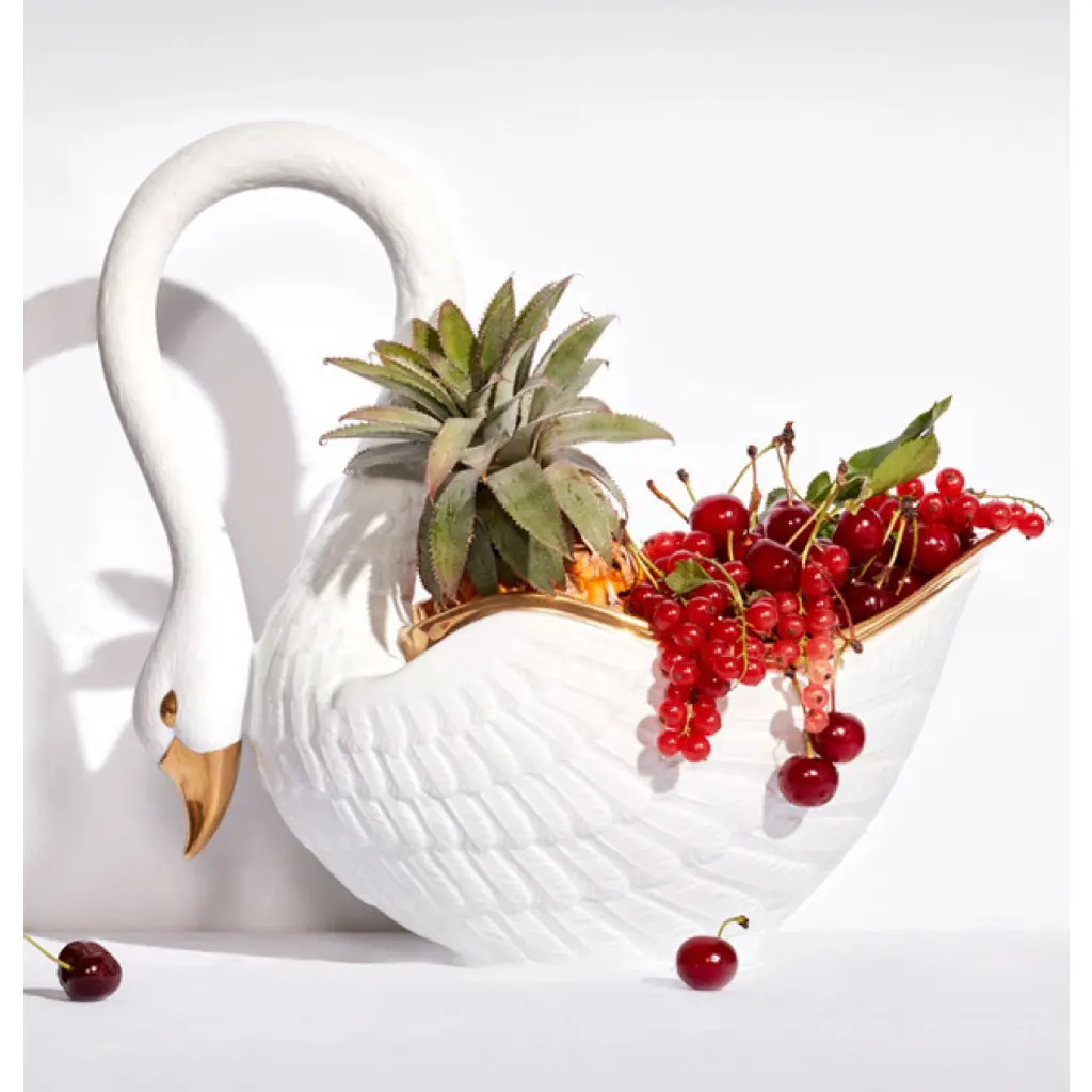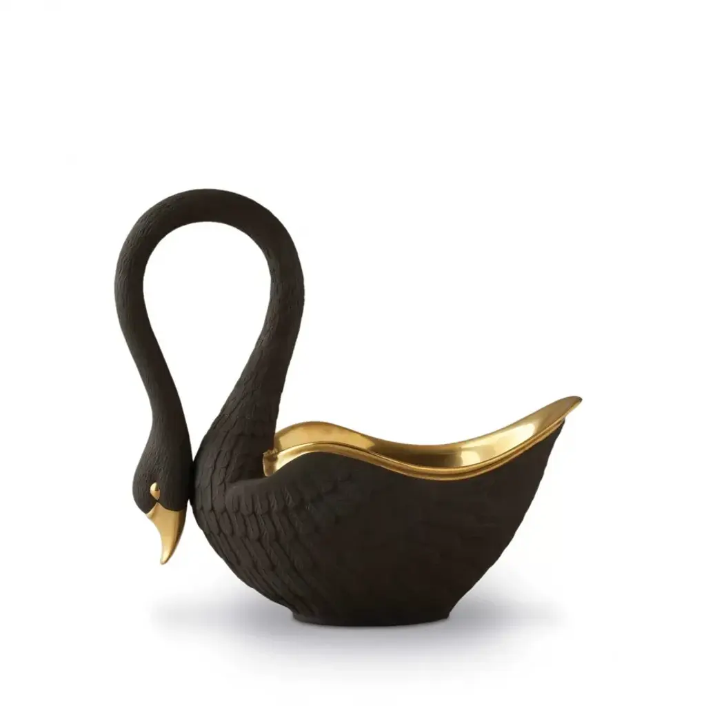 L’Objet Swans proudly nod to antiquity, with an unmistakably modern grace. From the hand-gilded 24-karat gold of the bowl, to the silky feathers on the magnificent curve of its neck, each swan is a singular and exquisite work of art, sculpted and finished entirely by hand. Please allow two weeks for delivery. Prior to founding L’Objet in 2004, Israeli-born Elad Yifrach was a successful designer in Beverly Hills. He was creating beautiful interiors, but he was frustrated by the limited options available in home accessories, so he set out to create something better. L’Objet’s collections are diverse, but they are almost always inspired by nature and architecture. Many of his exquisite serving pieces rest in a base of hand-crafted gold foliage, other pieces feature intricate design and beadwork, and some of the most striking objects actually look like miniature buildings. And despite the lux feel, much of the line is practical with just a touch of whimsy.