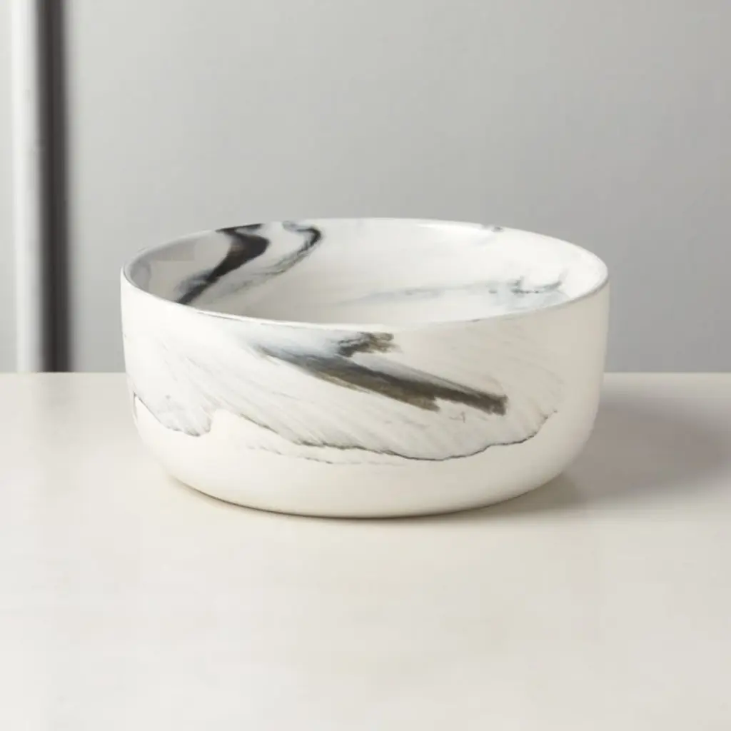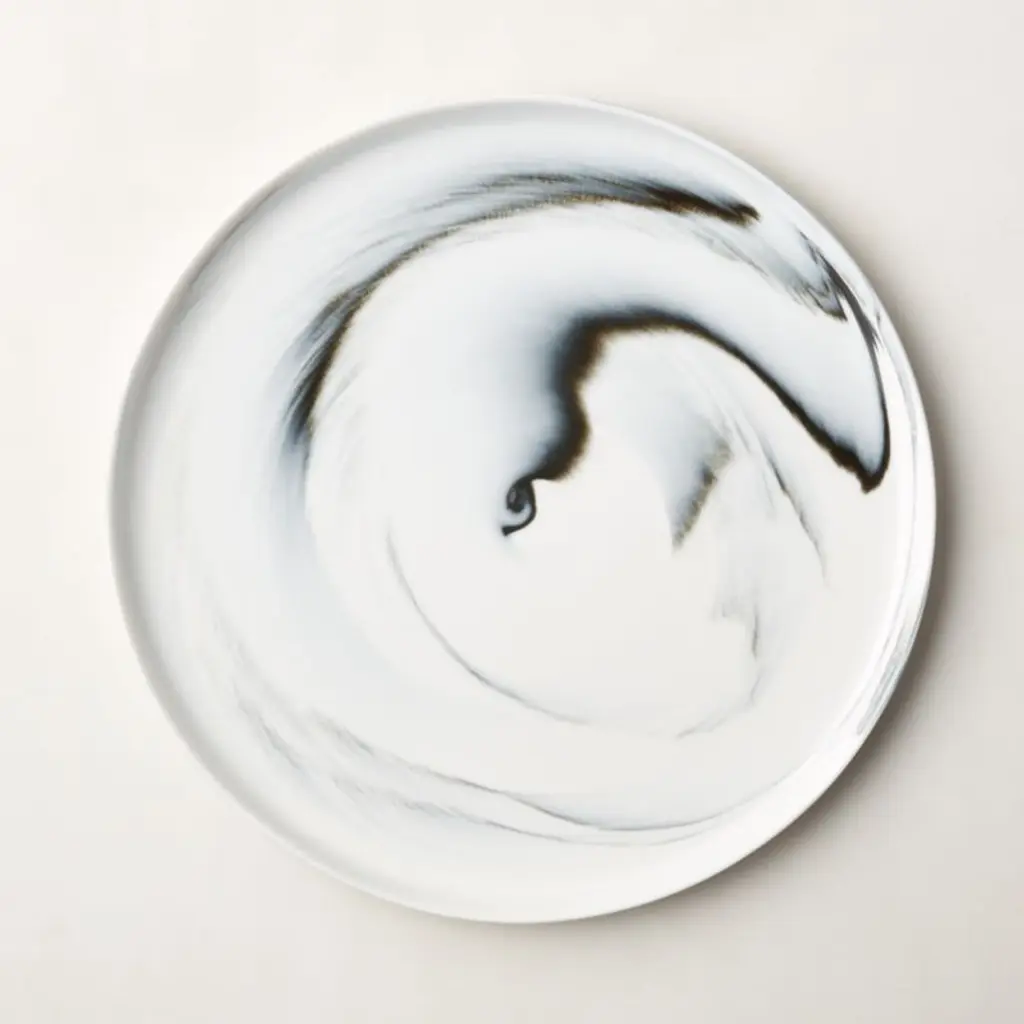 Raw porcelain mixed with color clay swirls to create black-and-white dinnerware inspired by designer Jennifer Fisher's favorite salad bowl at home. The end result is a unique marbleized effect that feels special and sophisticated but works for everyday. "I wanted something graphic that matched the rest of the collection, but with a neutral edge," says Fisher. "If you don't want to choose black or white, these are perfect. They're not too dark, they're not too light; they're just right." CB2 exclusive.