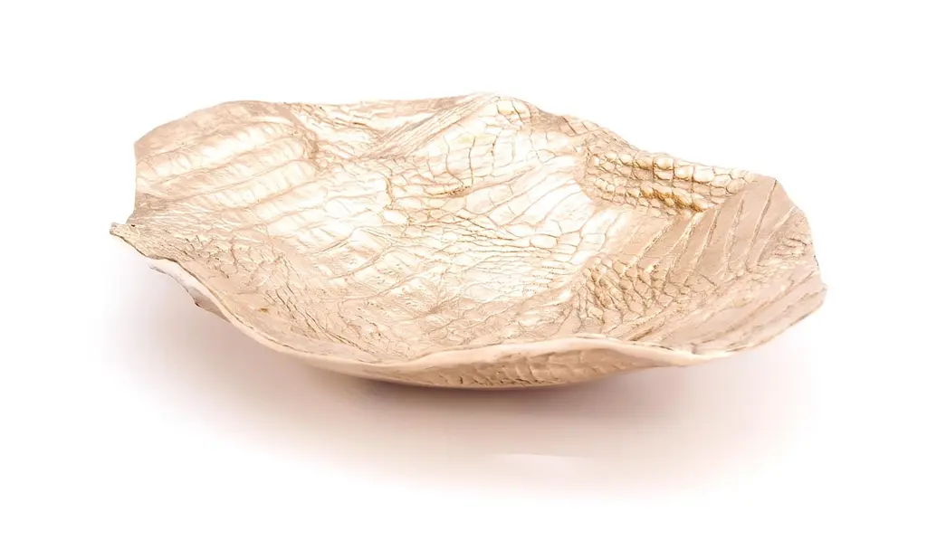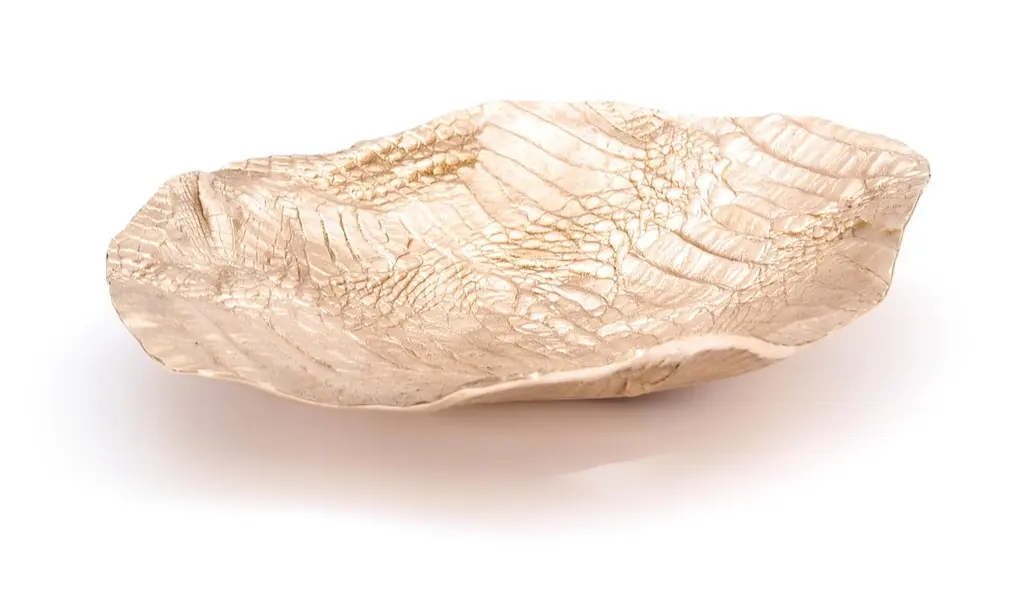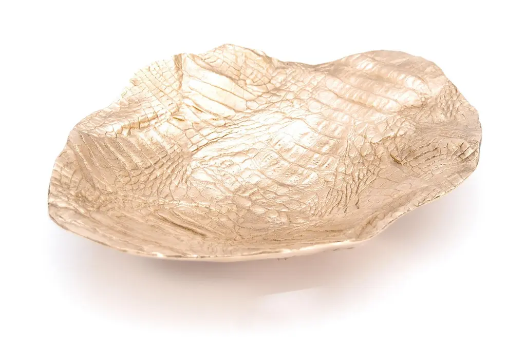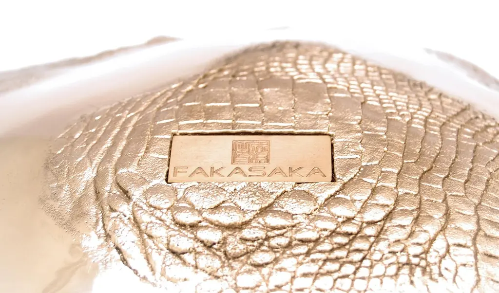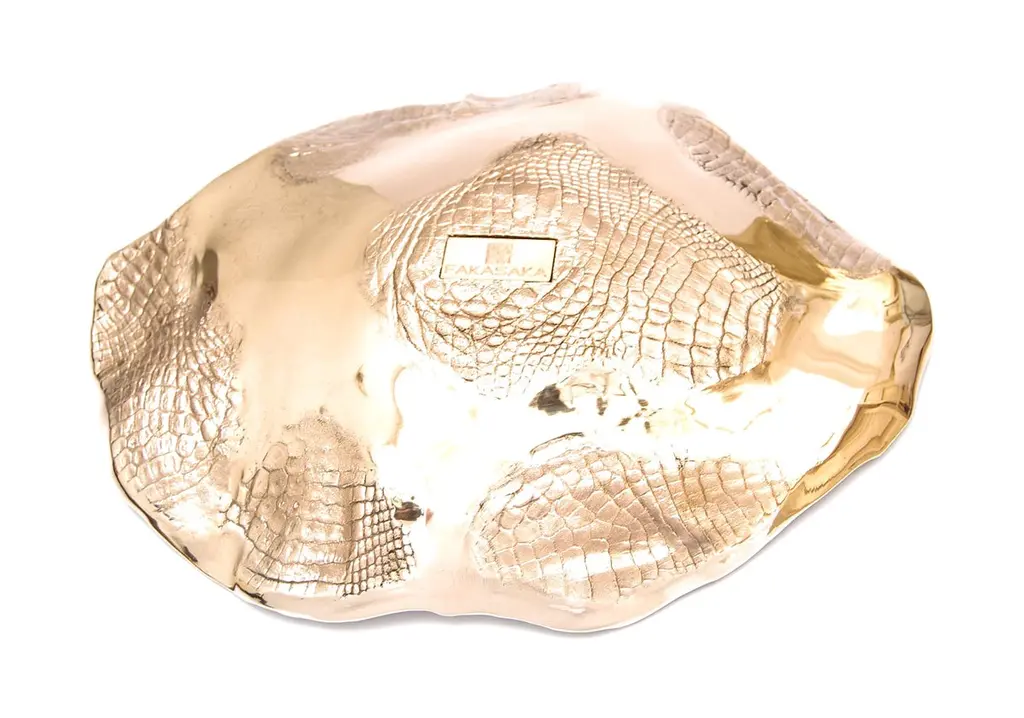 Teresa bowl by Fakasaka Design.Dimensions: W 32.5 cm D 25.5 cm H 6 cm.Materials: polished bronze. FAKASAKA is a design company focused on production of high-end furniture, lighting, decorative objects, jewels, and accessories. Established in 2007, Fakasaka is the eponymous design company by Brazilian artist Fernando Akasaka distinguished by a penchant for producing intricate detailed cast bronze collectible design objects, furniture and jewelries. Fakasaka explores the contrast between the manmade and the natural through shapes and finishes that create a clear aesthetic. The constant challenge to balance elements is met with an outcome that is a striking assortment of bronze furniture and objects in oxidised and polished finishes, accented with precious regional stones, granites and rich prehistoric reptilian motifs.